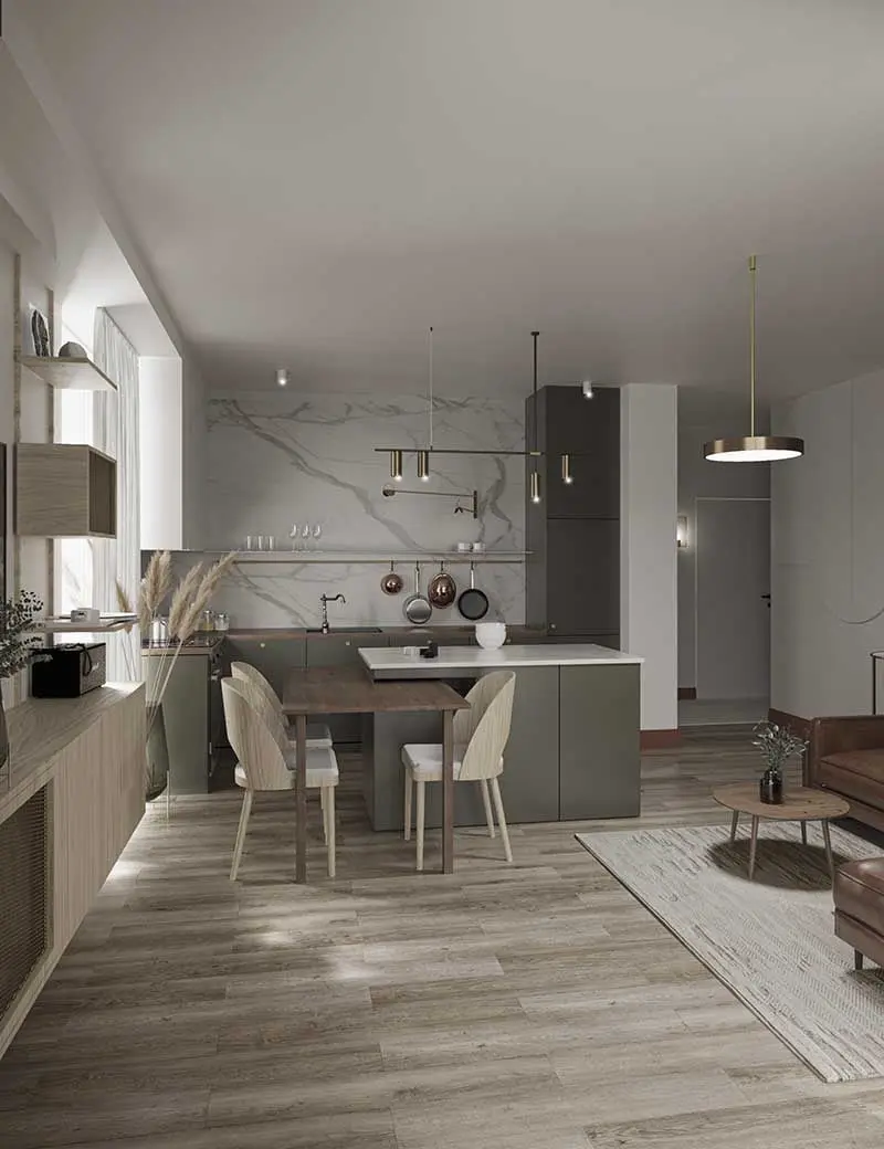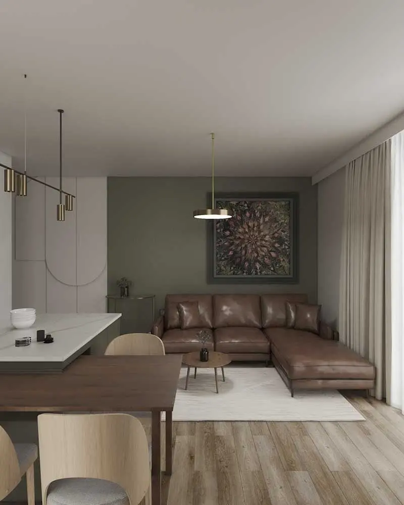 Mieszkanie 70 metrowe zlokalizowane na Mokotowie, zostało zaprojektowane przez pracownię architektoniczną Studio.Rysik. Wnętrze potrzebowało już poprawek na etapie deweloperskim. Inwestorzy chcieli, aby mieszkanie uzyskało bardziej funkcjonalny i dopasowany do ich stylu życia układ. Projekt dla młodego małżeństwa powstawał na początku 2020 roku. Po kilku miesiącach i folderach inspiracji, powstała aranżacja niezwykle przytulnego stawiającego na produkty dobrej jakości. Wnętrze jest utrzymane w naturalnych barwach, bardzo ciepłe i harmonijne w odbiorze. Kuchnia z oliwkowymi szafkami, sprytnie została połączona z częścią jadalnianą i otwarto ją na relaksujący salon. Całemu wnętrzu blasku dodają elementy złota, retro bateria, reling nad blatem, lampa zwieszana nad wyspą oraz w salonie.
