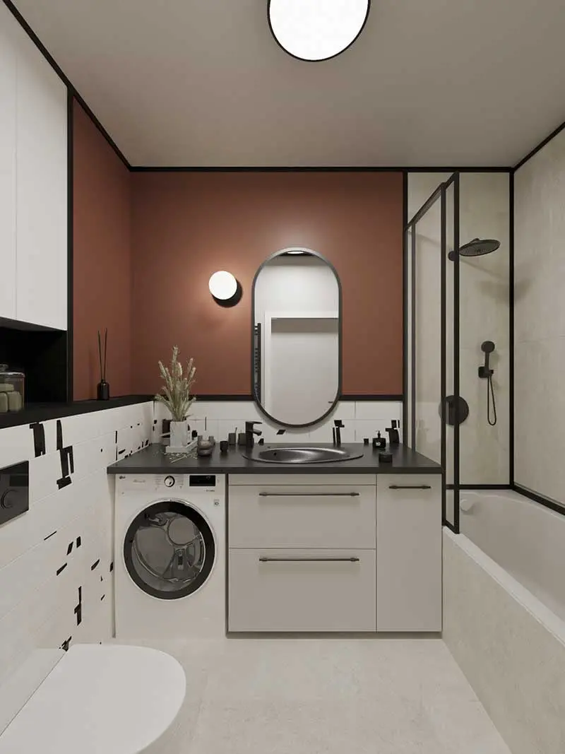 Łazienka minimalistyczna, lecz z wyraźnymi wyrysowanymi strefami. W strefie WC na ścianie przepiękne płytki 41zero42 Pack, strefie wannowej zastosowano natomiast beżowe płytki.