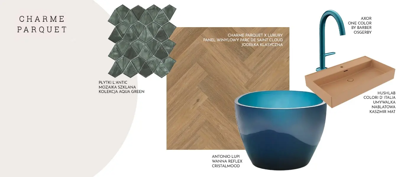 Łazienka jest duża i będzie spełniała rolę pokoju kąpielowego. Dlatego wybrano spektakularną wannę w kolorze niebieskim Antonio Lupi Reflex Cristalmood oraz idealnie współgrające z nią płytki wielkoformatowe Cifre oraz zjawiskową mozaikę L`Anitc. Ciekawym i zadziornym akcentem jest w tym projekcie nieoczywisty kaszmirowy kolor umywalki Hushlab z serii Colori d’ Italia.