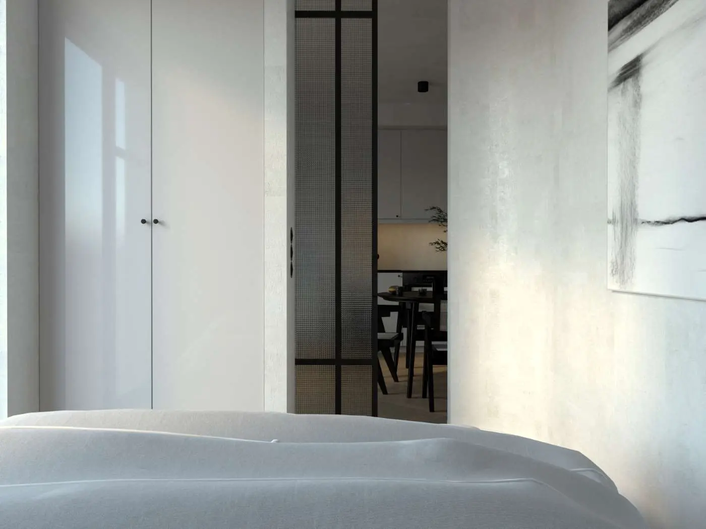 Mieszkanie choć niewielkich rozmiarów posiada wiele przeróżnych schowków i szaf do przechowywania. Drzwi kasetowe ze szkłem zbrojeniowym to znakomite rozwiązanie. Nie zajmują wiele miejsca oraz przepuszczają więcej naturalnego oświetlenia. Dzięki temu mieszkanie optycznie jest większe.