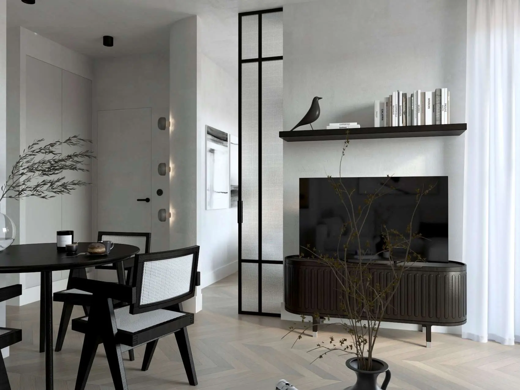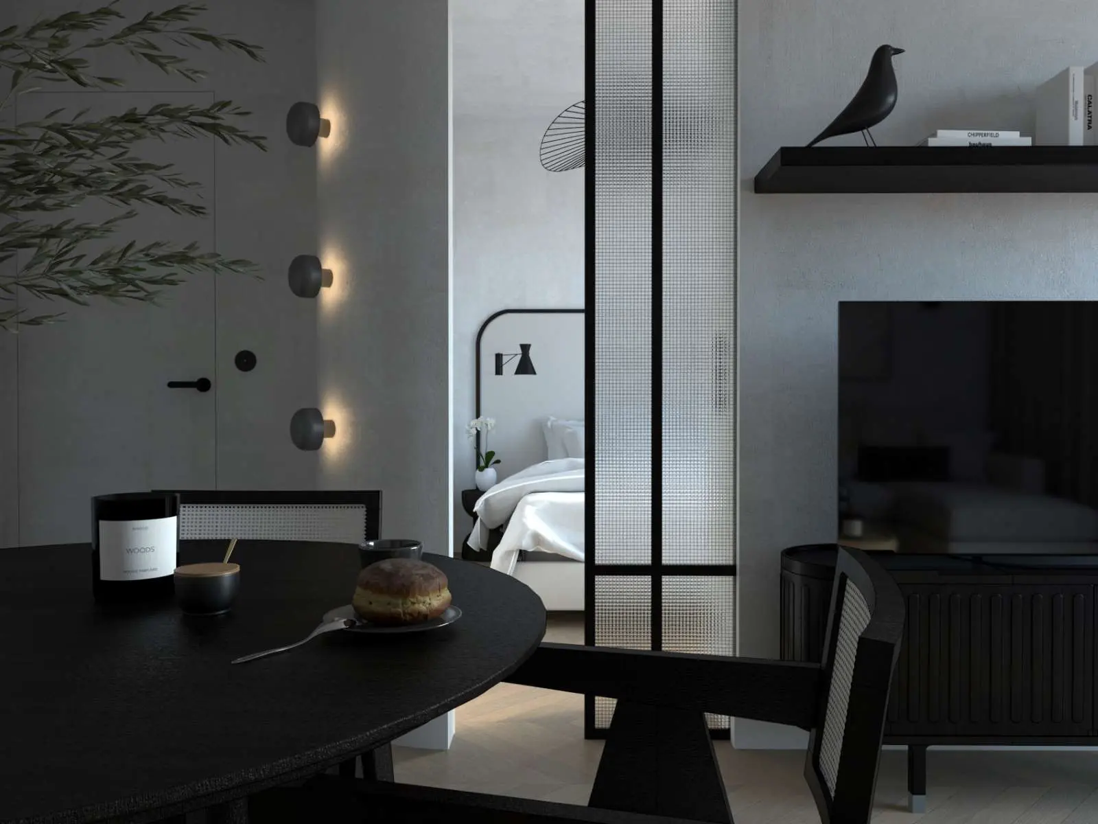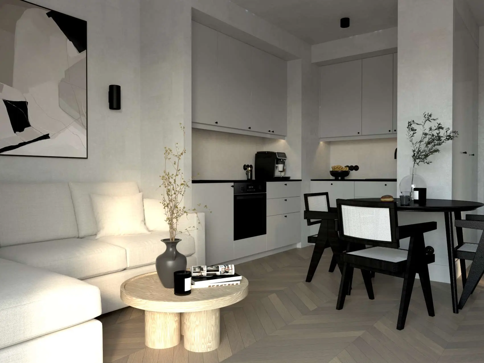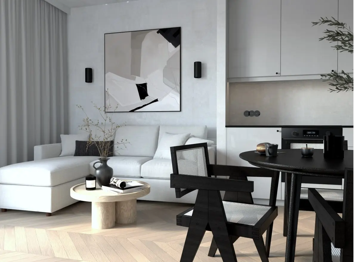 33 metrowe mieszkanie zostało urządzone w minimalistycznym stylu z wyraźnymi czarnymi akcentami. To idealne miejsce, które jest bezpieczną przystanią, w której można wyciszyć emocje, zapomnieć o stresach i dobrze odpocząć po zabieganym dniu. Największa powierzchnia mieszkania to strefa dzienna z otwartą kuchnią, jadalnią i salonem. Pozostały metraż stanowi sypialnia z dwuosobowym dużym łóżkiem, łazienkę oraz niewielki przedpokój. Za projekt tego wnętrza odpowiada architekt Kamil Wielgołaski z pracowni 94 Design.