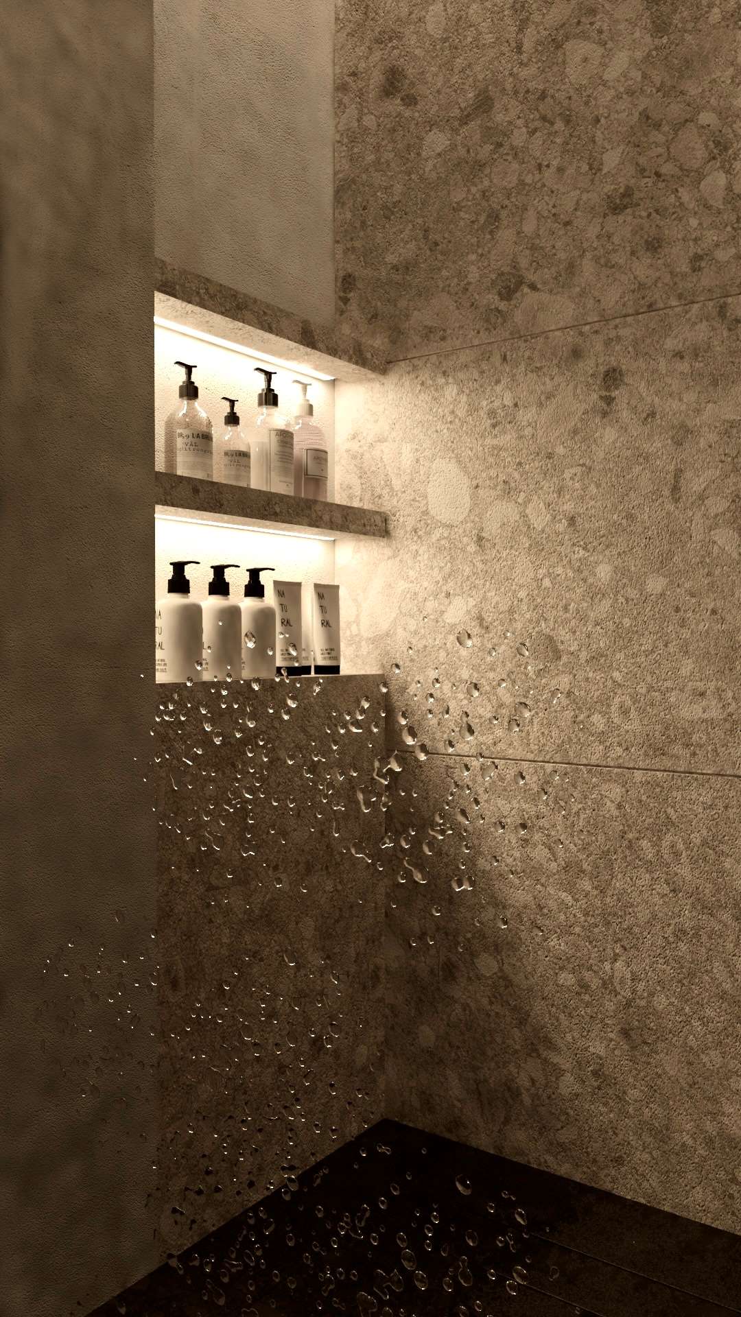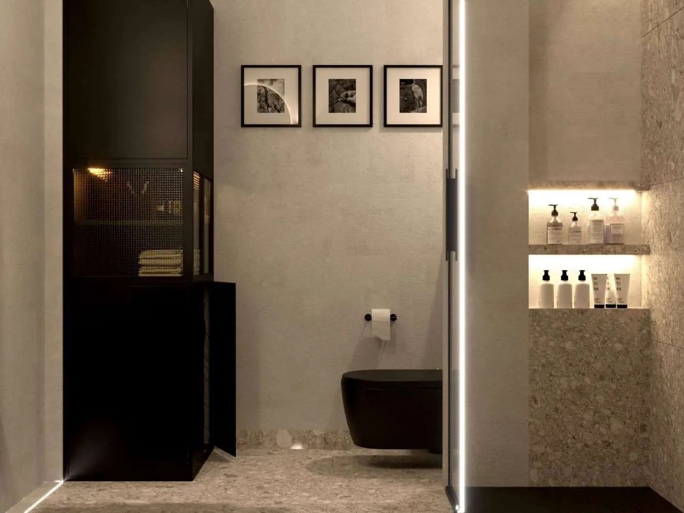 Łazienka została urządzona spójnie, harmonijnie z koncepcją całego mieszkania. Na podłogę i ścianę pod prysznicem wybrano terazzo, a resztę ścian pomalowano szarą farbą. Czarne dodatki w postaci armatury i ceramiki dodają charakteru. Przyjemną atmosferę tworzy oświetlenie starannie dobrane do tego projektu.