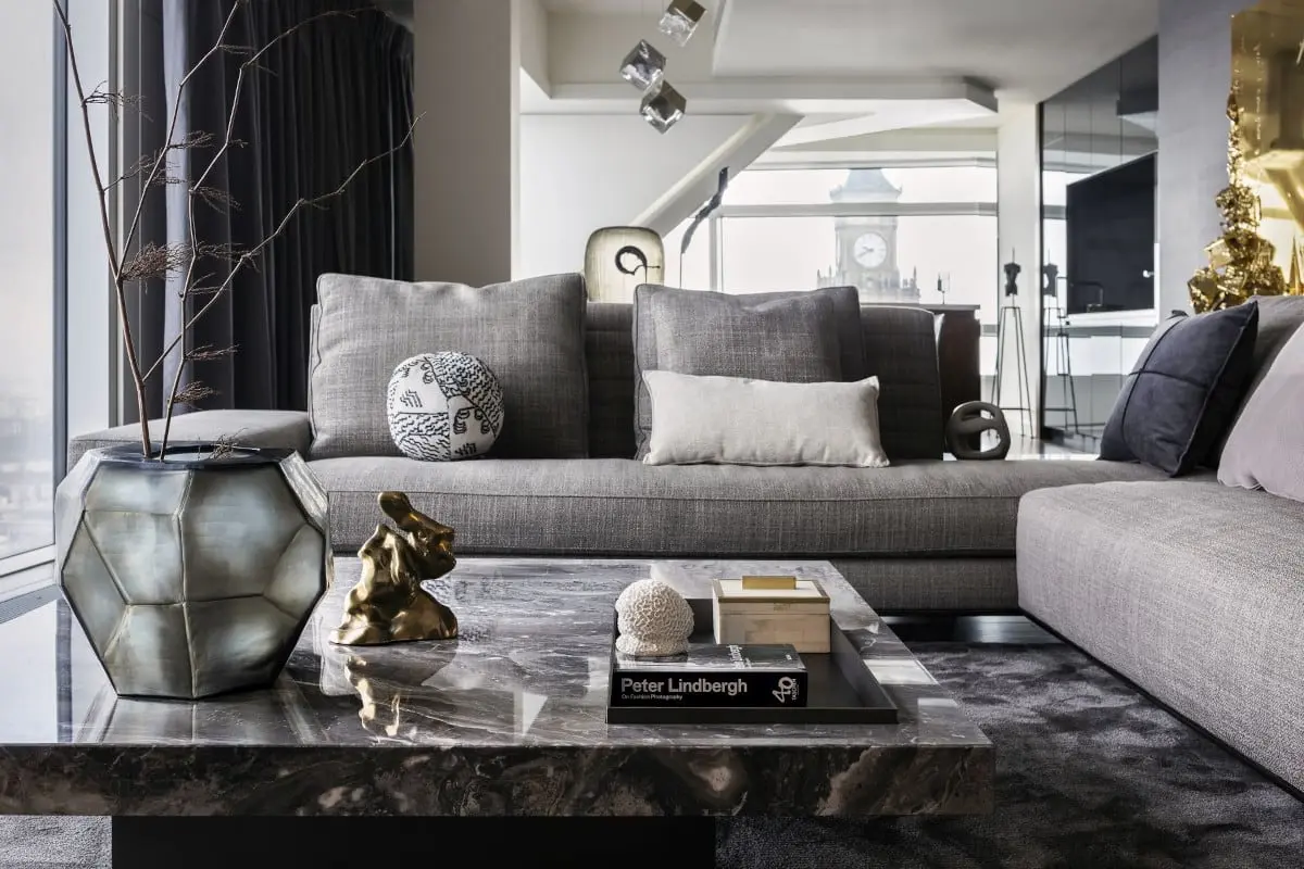 Przechodząc do kolejnych stref znajdujemy tu ikony designu, szlachetne materiały i niebanalne formy. Stół proj. Edwarda Barbera i Jay’a Osgerby’ego dla B&B Italia, jest sam w sobie rzeźbą. Charakteryzuje go nietypowy, posągowy wygląd, który dodaje wnętrzu nuty modernistycznego stylu i wzbogaca je o atmosferę tajemniczości.