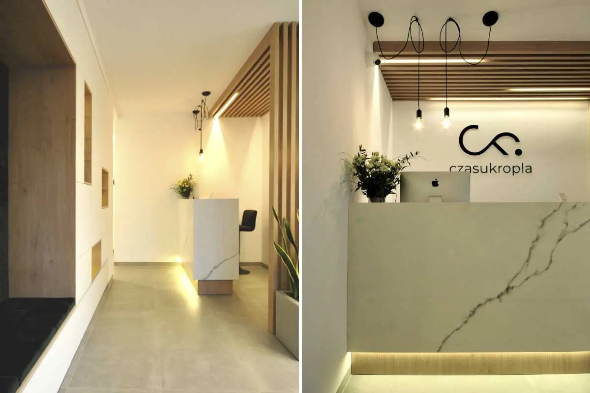 Wnętrza zostały w 100% urządzone zgodnie z projektem i wybranymi materiałami. Założeniem było stworzenie prostego, bryłowego i bardzo eleganckiego wnętrza, nawiązującego do świadczonych w nim na najwyższym poziomie usług, gdzie najistotniejsze jest komfortowe samopoczucie klientów. Jak przy każdym dobrym minimalizmie, nie było mowy o oszczędzaniu na materiałach, a najmniejszemu detalowi, należało poświęcić maksimum uwagi. Klient obdarzył mnie dużym zaufaniem i dał mi wolną rękę, ponieważ nie był to pierwszy wspólnie realizowany projekt.