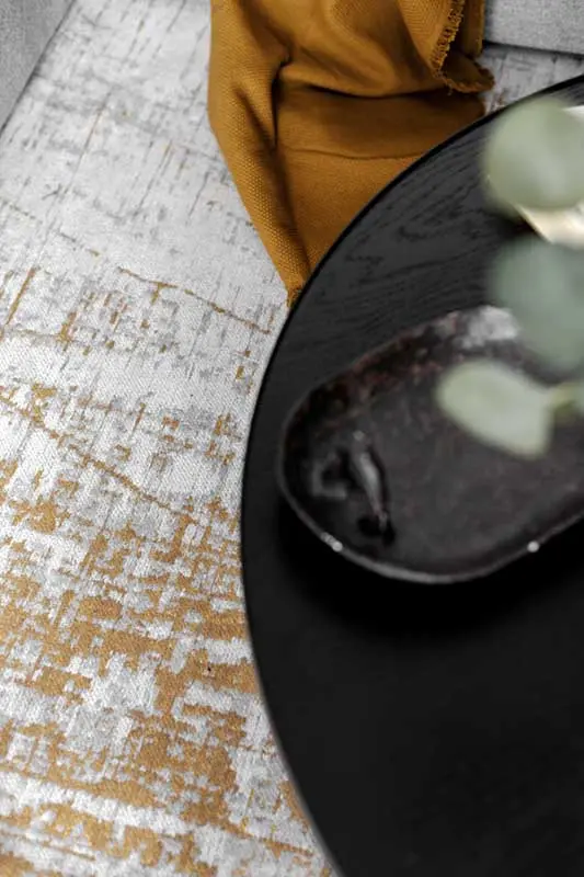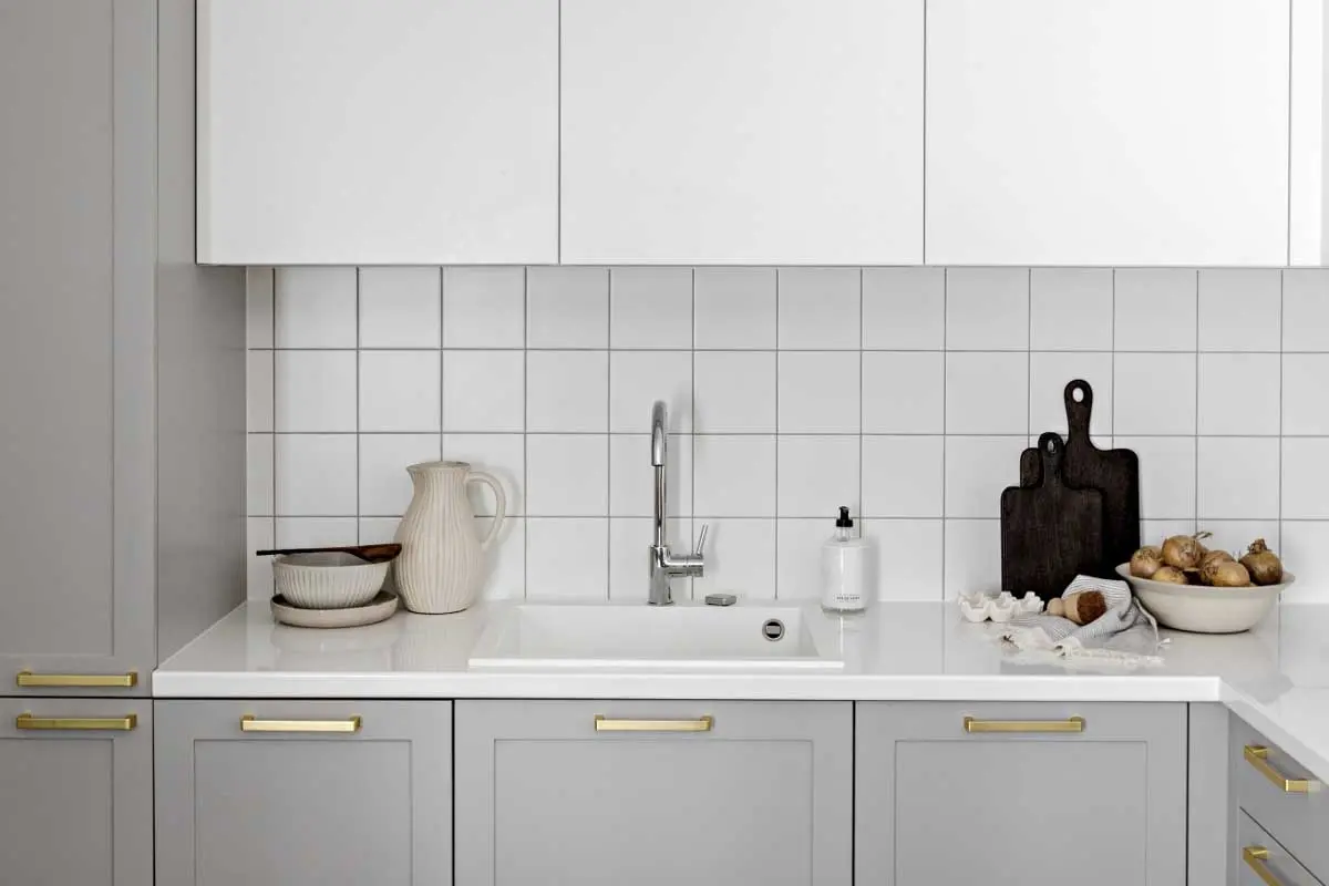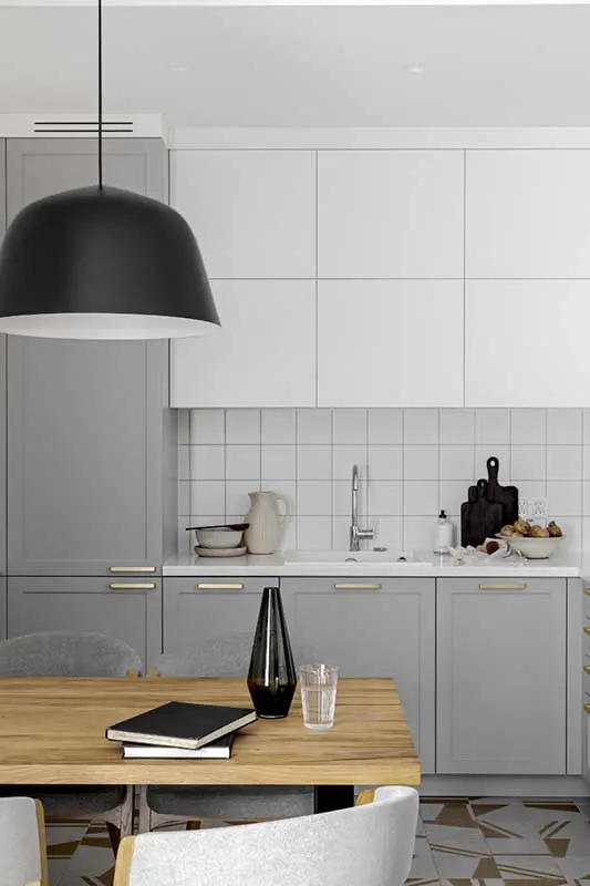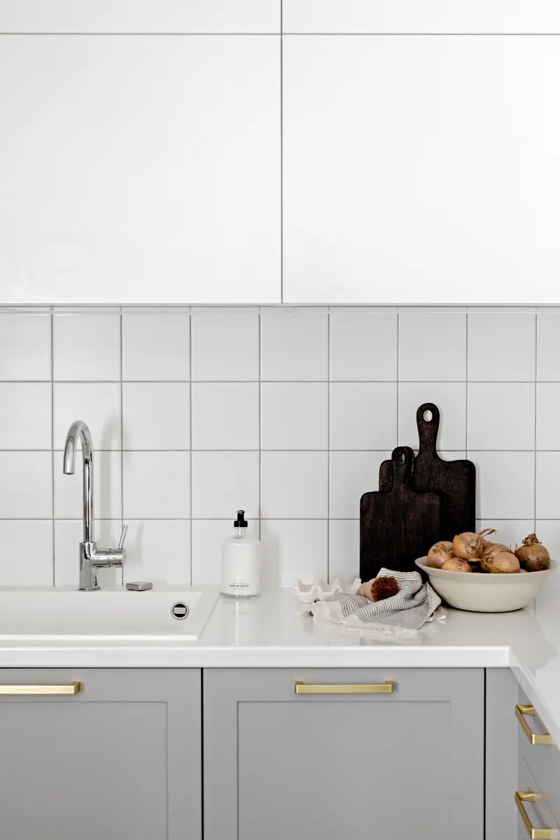 Charakterystycznym elementem w mieszkaniu, który znajdziemy zarówno w kuchni, jak i łazience, są złote kafle w geometryczny wzór. Dzięki temu, że same w sobie są bardzo dekoracyjne, w obu przypadkach stanowią główny element aranżacji. Pozostałe detale wystroju, takie jak chociażby uchwyty przy meblach czy kolorystyka dodatków, zostały do nich dopasowane w taki sposób, aby dopełniały ich urodę, a nie konkurowały z nią.