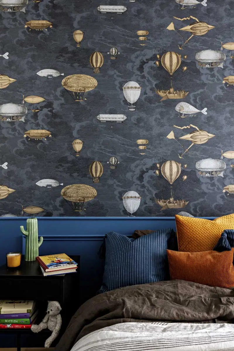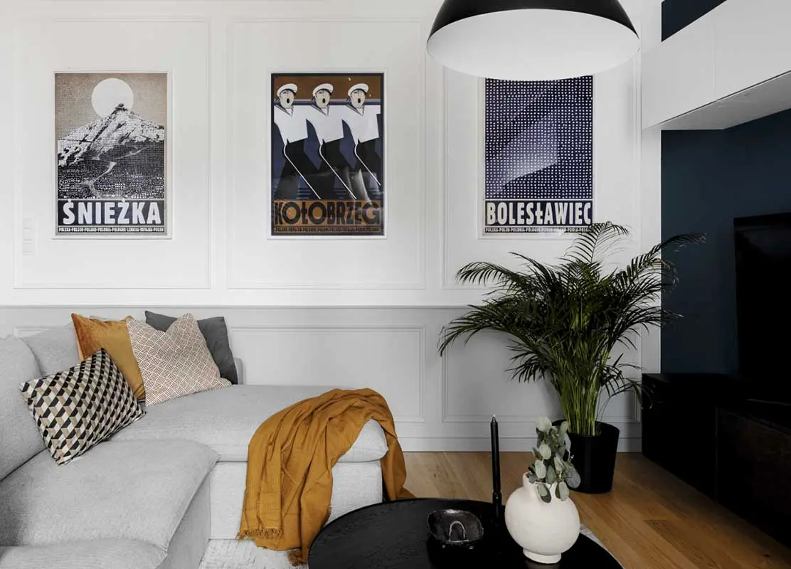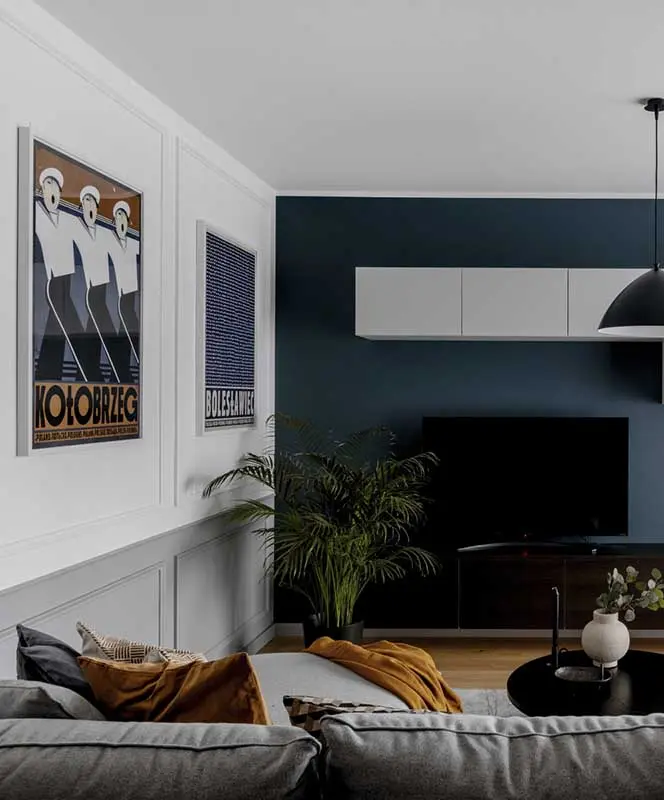 Mocnym akcentem barwnym jest granatowa ściana w salonie, która wraz z plakatami, karmelowym fotelem i dywanem łączącym kolorystycznie całość, definiuje charakter wnętrza. Dzięki przemyślanemu układowi listewek na ścianach, plakaty tworzą spójną mini galerię. Urodę sztukaterii podkreśla subtelna lamperia w kolorze narożnika. Elementem przybliżającym nas do natury jest duża palma wyeksponowana w czarnej donicy. Wraz z lampą nadają wnętrzu nieco industrialny sznyt.