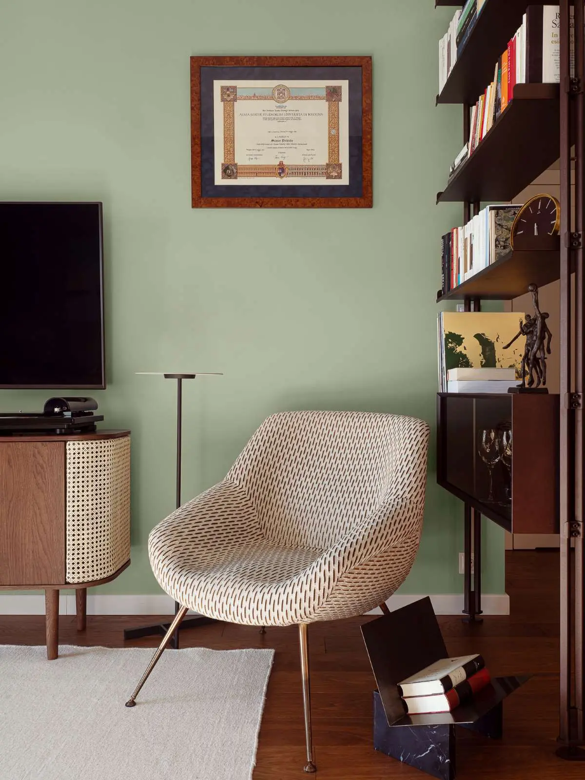 do wyznaczenia granic użył biblioteczki wolnostojącej. Na półkach można wyeksponować znalezione w antykwariacie przedmioty, jak również odstawić filiżankę kawy przy lekturze. Regał nie ogranicza ilości światła jest lekki w swojej konstrukcji oraz ciekawie podkręca dość spokojną aranżację.