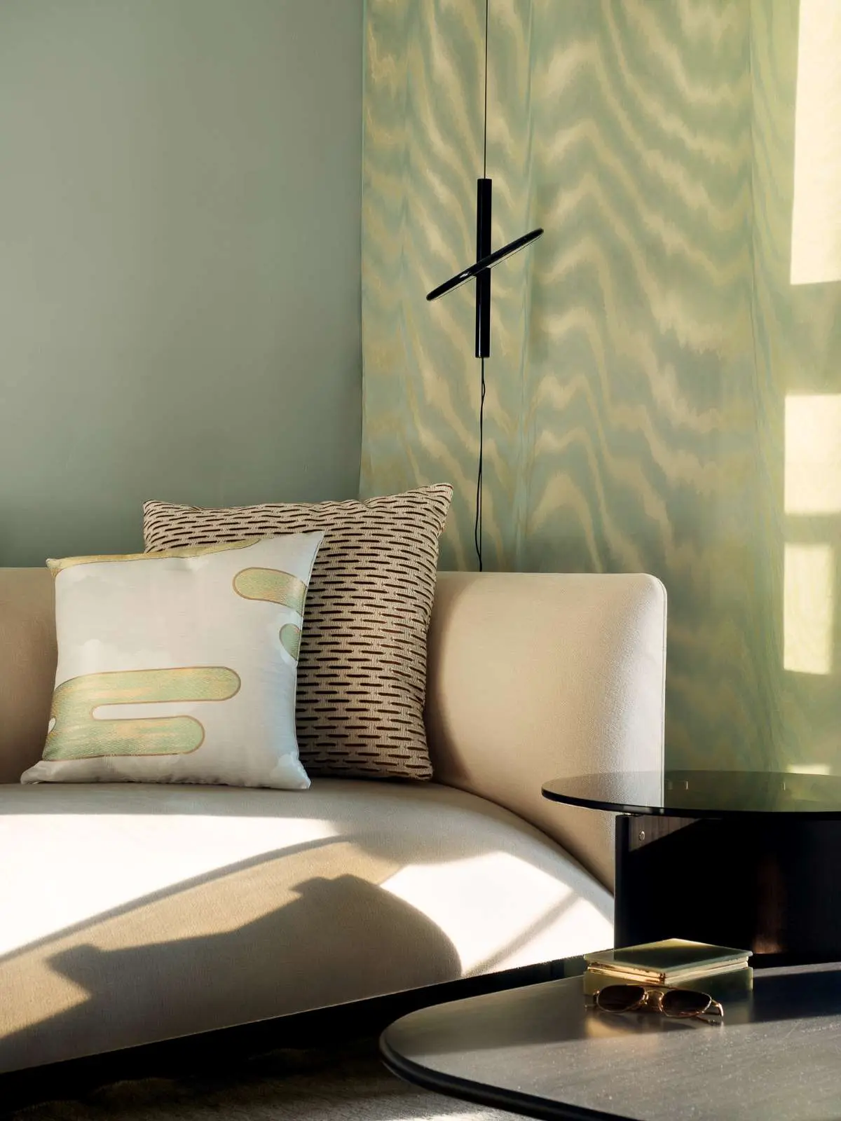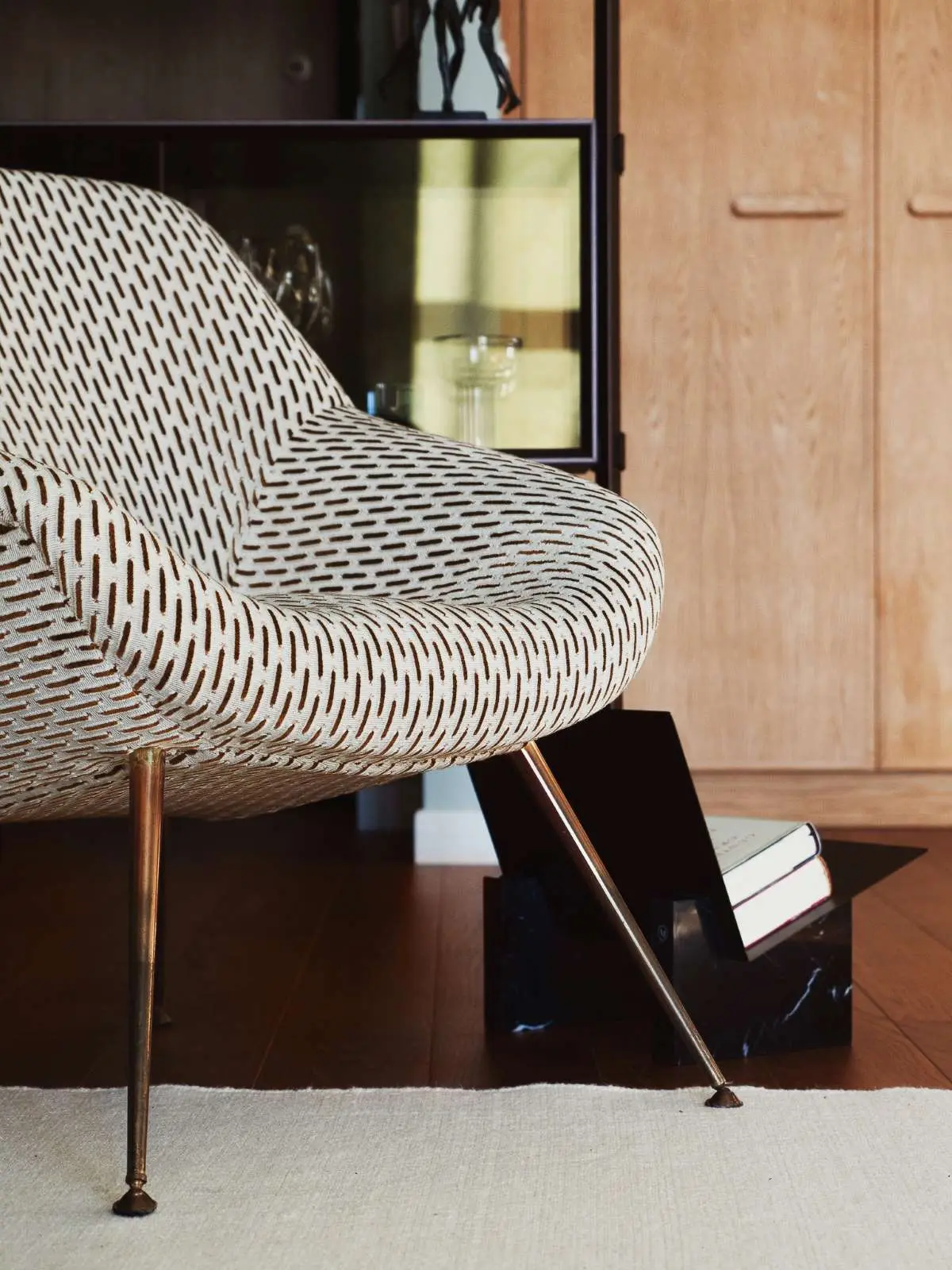 Zadecydowano, aby we wnętrzu znalazło się subtelne oświetlenie, które również będzie w łatwy sposób kreowało nastrój panujący w salonie. Szaleństwem w tym stonowanym projekcie jest zdecydowanie tkanina, jaka została wybrana na obicie fotela. Ten sam print pojawia się również na poduszce dekoracyjnej znajdującej się na sofie.
