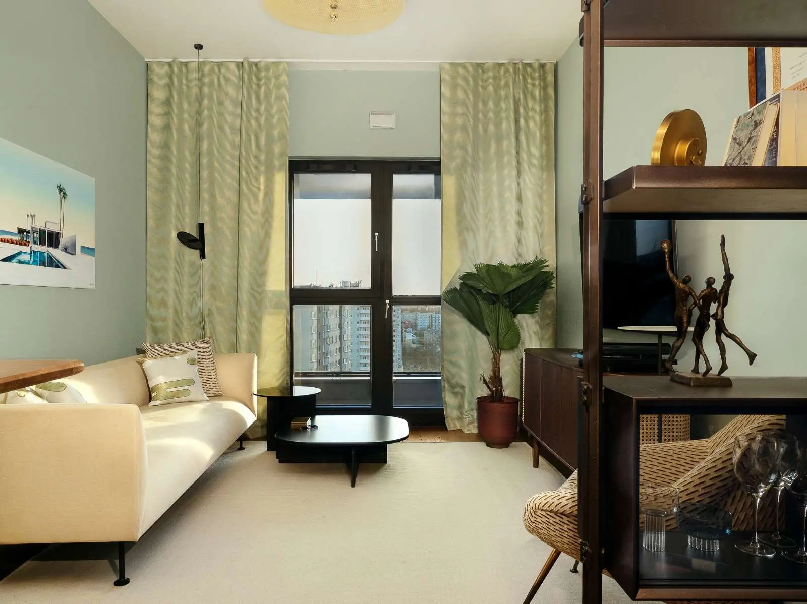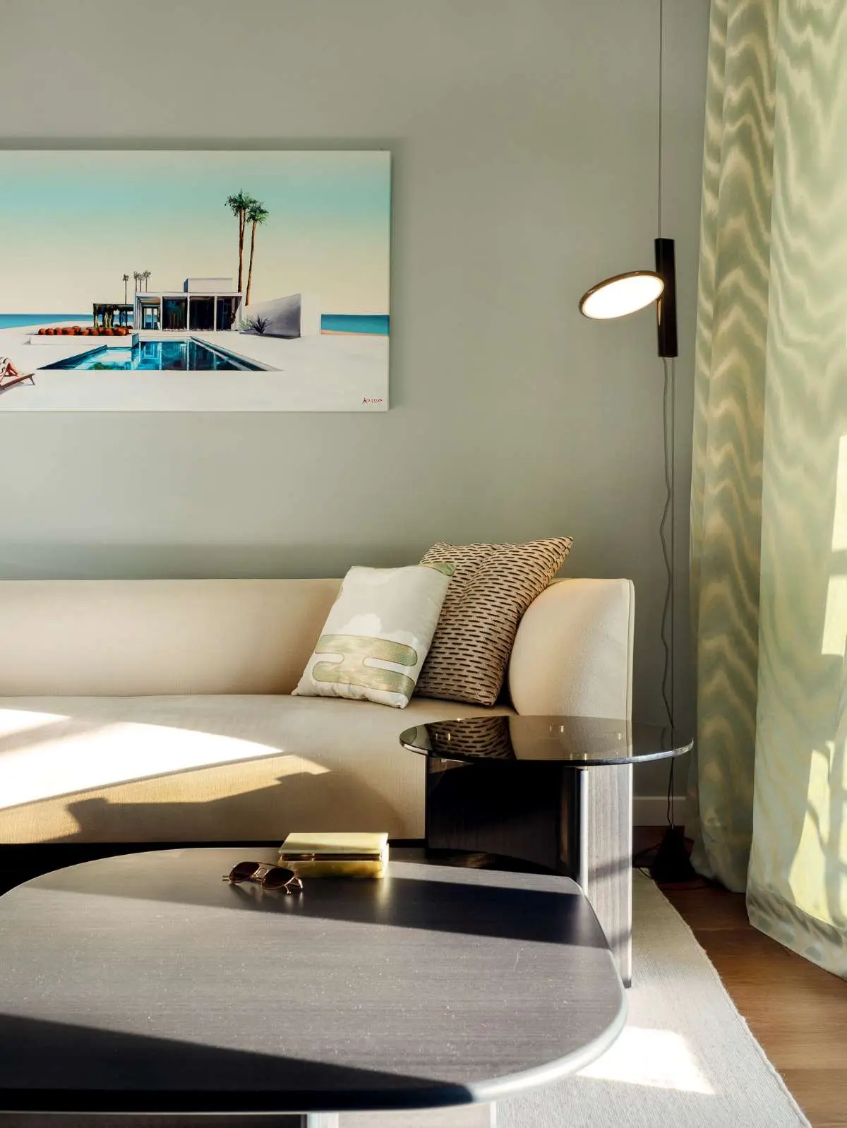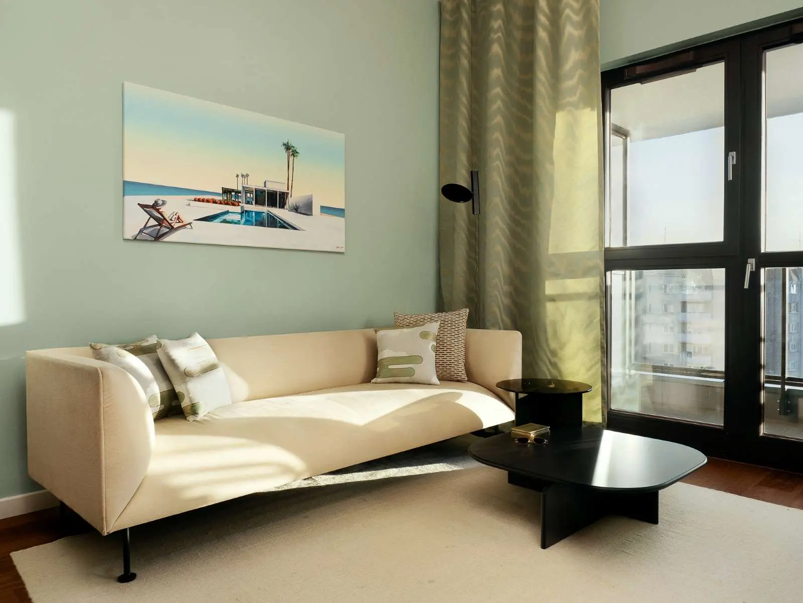 Strefa wypoczynkowa w otwartej części dziennej jest urządzona z ciekawymi w formie meblami, ale nie brakuje jej przytulności. To zasługa naturalnych materiałów i kolorów. Zieleń na ścianie, pod wpływem naturalnego światła wpadającego przez duże okno ma subtelny, szałwiowy odcień, który świetnie komponuje się z ciemną podłogą. Ten odcień zieleni zmienia się w zależności od pory dnia oraz pogody. Zwieńczeniem aranżacji jest obraz, polskiego artysty Rafała Knopa pochodzący z serii „Swimming Pool”, którego inspiracją była stylistyka lata 60.