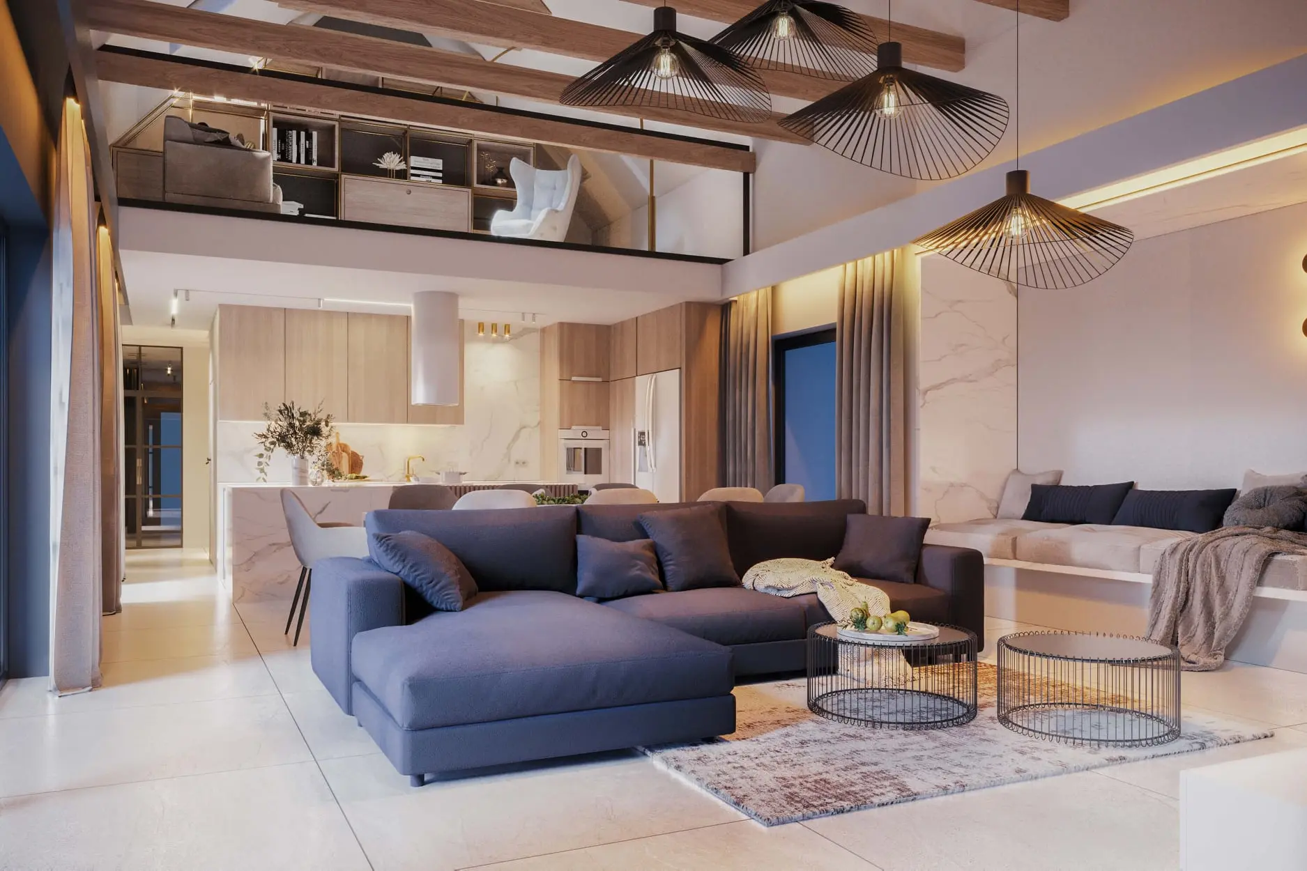 Do aranżacji wnętrza użyto materiałów najwyższej jakości, aby stworzyć funkcjonalną i nowoczesną przestrzeń dla domowników. Kuchnia stanowi otwartą przestrzeń, w której na pierwszy plan wysuwa się znakomite połączenie drewnianych szafek z pięknym marmurem o delikatnym eleganckim żyłkowaniu.