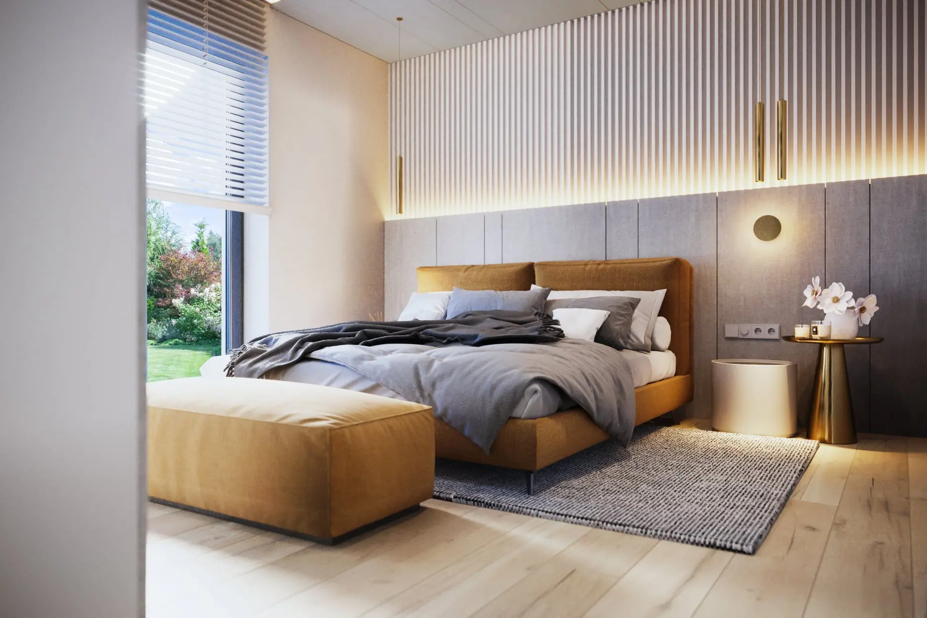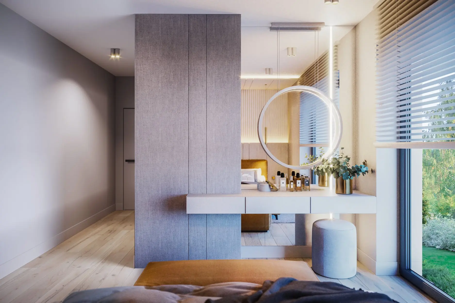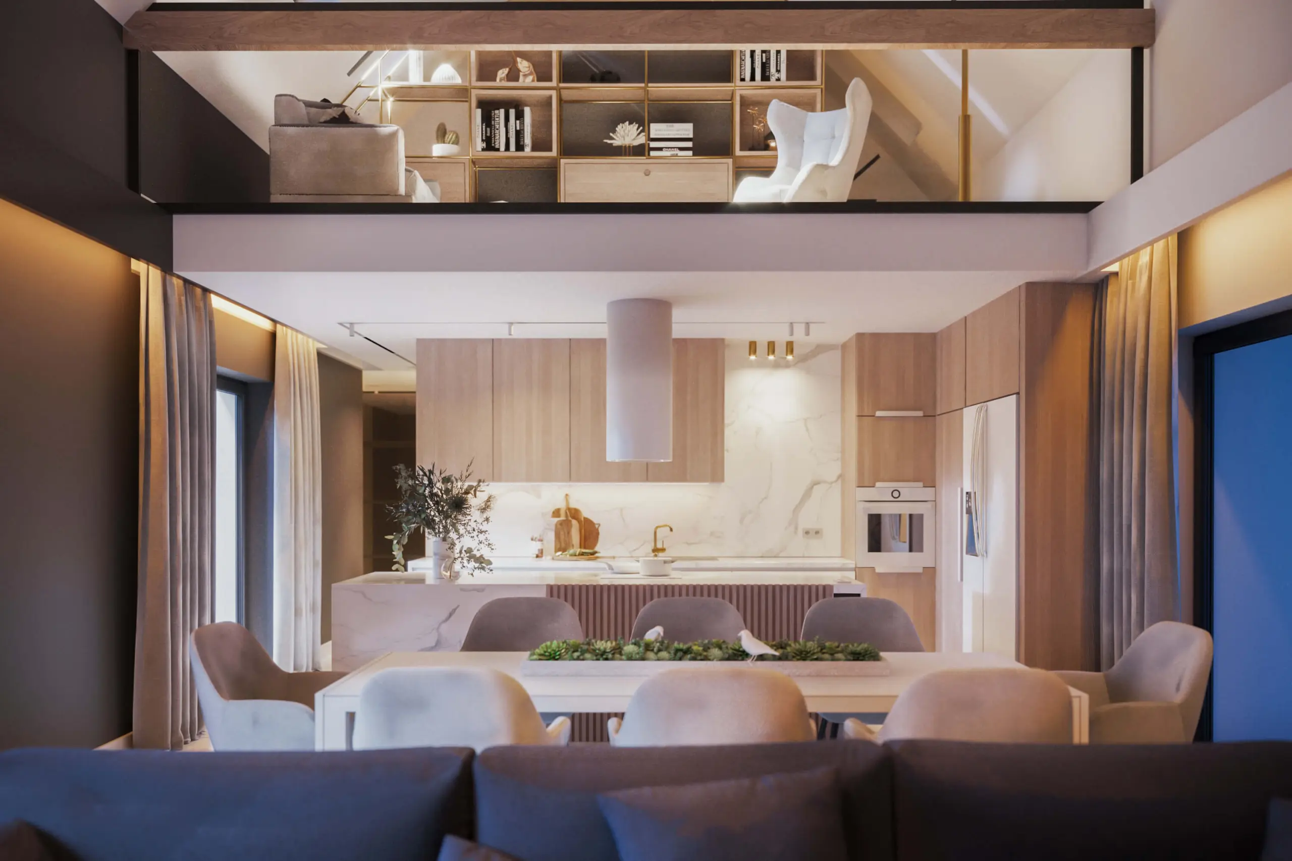 Projekt wnętrza łączy przytulny nastrój z elegancją. Architektka wykorzystała harmonijne zestawienia jasnego drewna z bielą, antracytem i złotymi dodatkami.