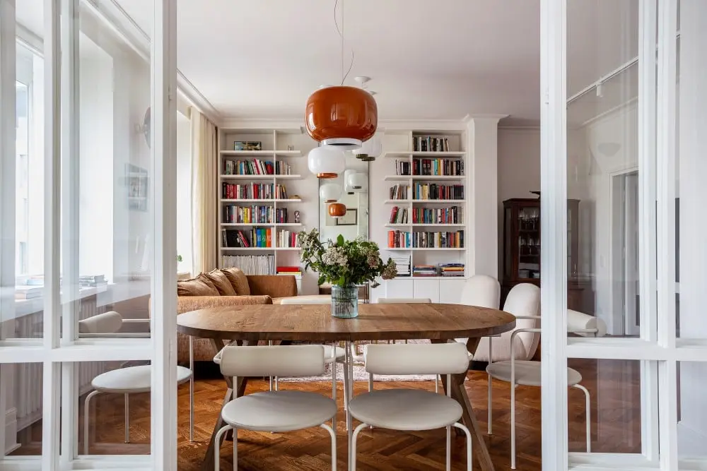 Już od wejścia jesteśmy wprowadzeni w klimat całego wnętrza. Dynamika drewnianego parkietu zapowiada odniesienia do stylu paryskich kamienic. I choć mieszkanie idealnie wpisuje się w aktualne trendy, ma się wrażenie, że jego serce bije w rytmie retro. Odrestaurowane żeberkowe grzejniki, meble vintage, wyszukane oświetlenie inspirowane japońskimi latarniami i klimatyczne dywany w perskim stylu mówią o wielowątkowości, dużej świadomości i odwadze do wyrażania siebie oraz śmiałym zacieraniu granic między tym co było, co teraz i co będzie. Wszystko to składa się na ponadczasową aranżację, skrojoną na miarę potrzeb mieszkańców.