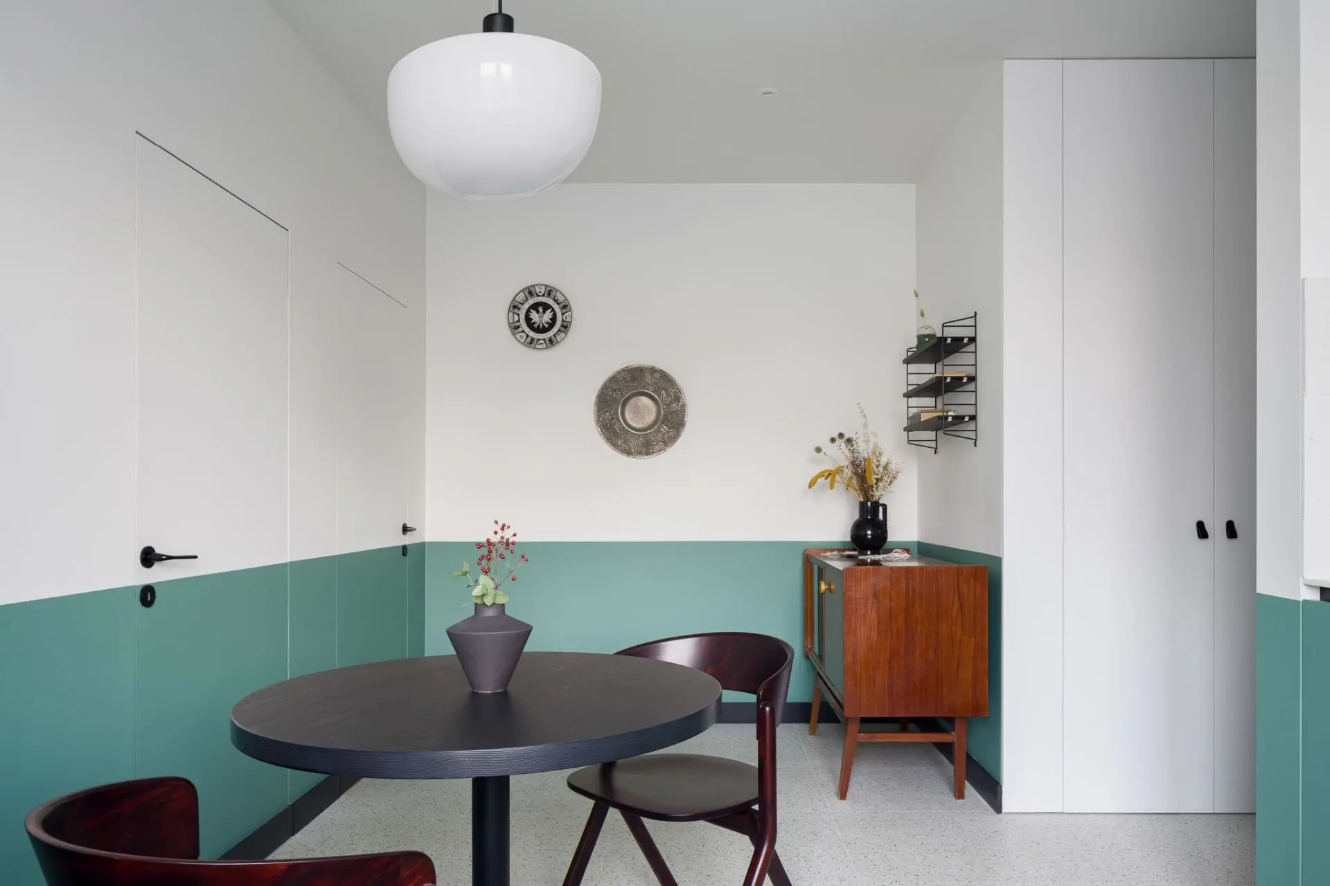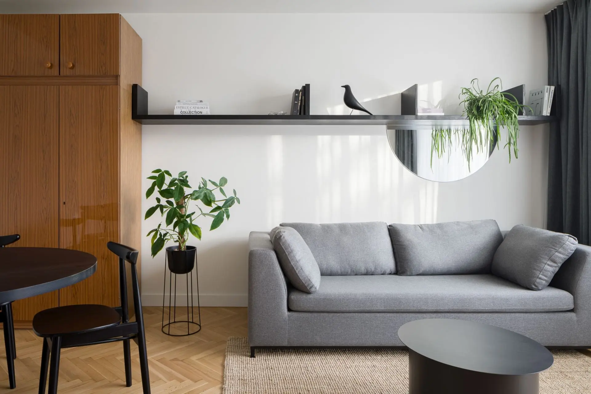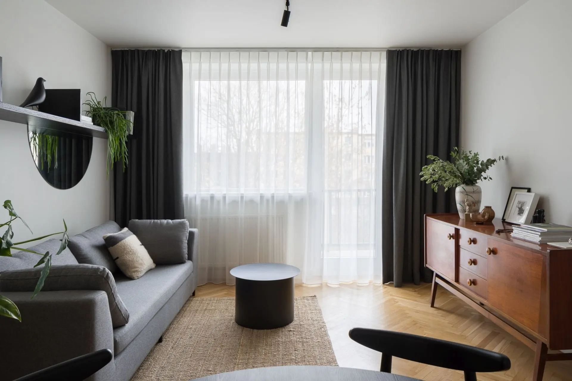 Przestrzeń w mieszkaniu utrzymana jest w jasnych barwach – bieli oraz szarości. Akcentem, który przełamuje tę stonowaną kompozycję są szafki kuchenne w odcieniach zieleni. Wzrok przyciąga także nowoczesny stół z krzesłami w ciemnym kolorze. Projektanci na prośbę właścicieli, zachowali także oryginalne meble z okresu PRL, które tworzą domową atmosferę. Elementy retro zostały zestawione z wyposażeniem nowoczesnym i perłami designu od znanych projektantów. W ten sposób tworzą piękną mozaikę, która jest nie tylko elegancka, ale – co równe ważne – funkcjonalna. Całość dopełnia stary parkiet, który został jedynie odświeżony i wycyklinowany, więc idealnie komponuje się z pamiętającymi PRL meblami, a także stanowi bazę do innych elementów wystroju wnętrza.