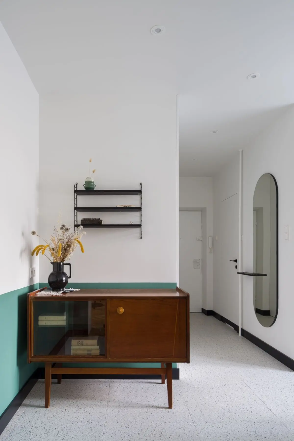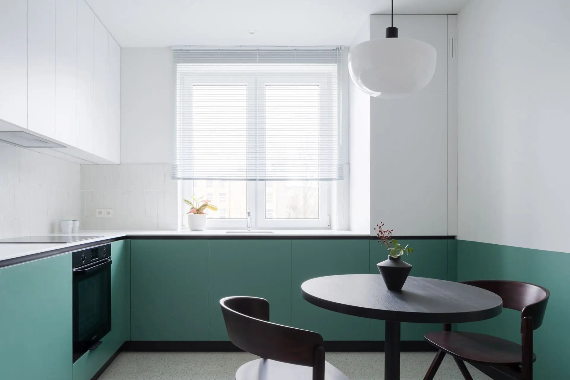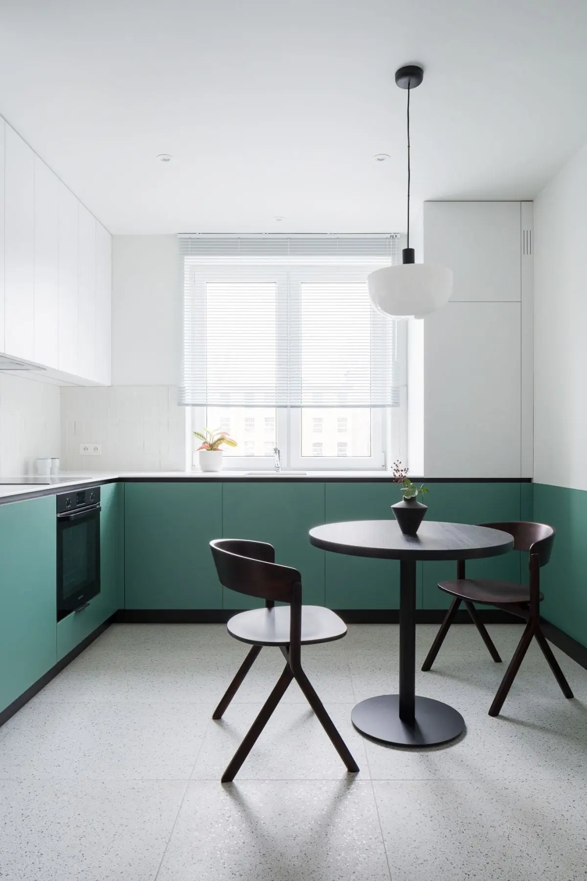 Przestrzeń w mieszkaniu utrzymana jest w jasnych barwach – bieli oraz szarości. Akcentem, który przełamuje tę stonowaną kompozycję są szafki kuchenne w odcieniach zieleni. Wzrok przyciąga także nowoczesny stół z krzesłami w ciemnym kolorze. Projektanci na prośbę właścicieli, zachowali także oryginalne meble z okresu PRL, które tworzą domową atmosferę. Elementy retro zostały zestawione z wyposażeniem nowoczesnym i perłami designu od znanych projektantów. W ten sposób tworzą piękną mozaikę, która jest nie tylko elegancka, ale – co równe ważne – funkcjonalna. Całość dopełnia stary parkiet, który został jedynie odświeżony i wycyklinowany, więc idealnie komponuje się z pamiętającymi PRL meblami, a także stanowi bazę do innych elementów wystroju wnętrza.