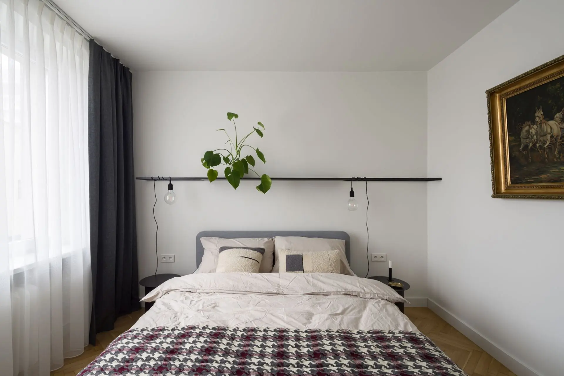 Właściciele od początku planowali zaaranżowanie przestrzeni na wynajem. W związku z tym, jej układ został rozplanowany w taki sposób, aby odnalazły się tutaj zarówno rodzina, jak i dwie niezależne osoby, które mogą chcieć zachować autonomię i prywatność. W centrum mieszkania znajduje się przestrzeń wspólna wraz z kuchnią, dzięki czemu każdy może mieć do niej dostęp. Z kuchni natomiast można przejść do dwóch pozostałych pomieszczeń, z których jedno zostało zaaranżowane na minimalistyczną sypialnię, a drugie – na salon, którego wnętrze nie przytłacza dużą ilością mebli. Mimo to w każdym z nich pomyślano o miejsca do pracy, dzięki czemu home office czy nauka zdalna będą tu przebiegać w komfortowych warunkach.