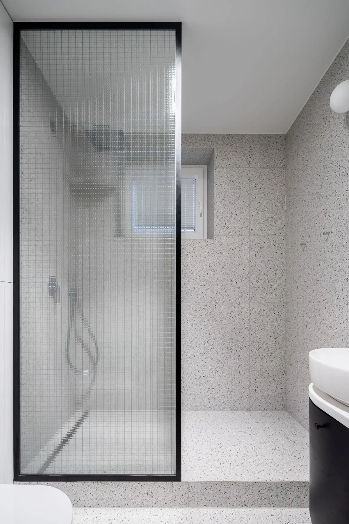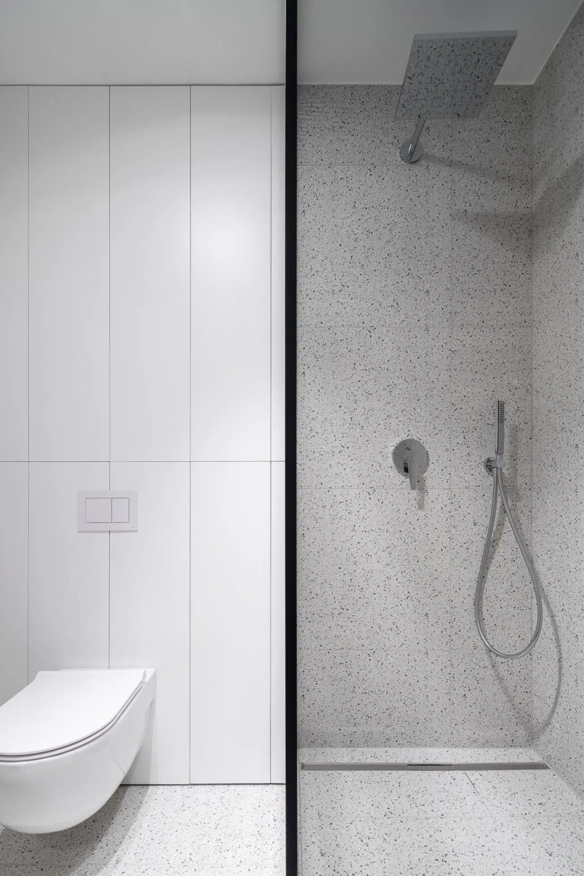 Prysznic, mimo dużych rozmiarów, nie dominuje w pomieszczeniu. W całości został pokryty glazurą w kolorze ścian, a do jego wykończenia użyto m.in. odpływu liniowego Geberit CleanLine, który nie tylko jest elegancki i uniwersalny, ale także wytrzymały, bo wykonany ze stali nierdzewnej. Zapewnia mu to długotrwałą funkcjonalność i atrakcyjny wygląd. W tym wypadku projektanci zadbali przede wszystkim o wygodę użytkowników mieszkania, gdyż odpływ liniowy Geberit CleanLine cechuje łatwość czyszczenia, a jego kształt sprawia, że w rynnie nie gromadzi się brud i nieprzyjemne zapachy. Wzrok przykuwa także czarna listwa dookoła prysznica, która kolorystyką nawiązuję do szafki pod umywalką, tworząc spójną całość. Wytrzymałość wyposażenia pozwoli na wiele lat użytkowania, a forma nie przytłacza i stanowi ponadczasowy element wyposażenia.