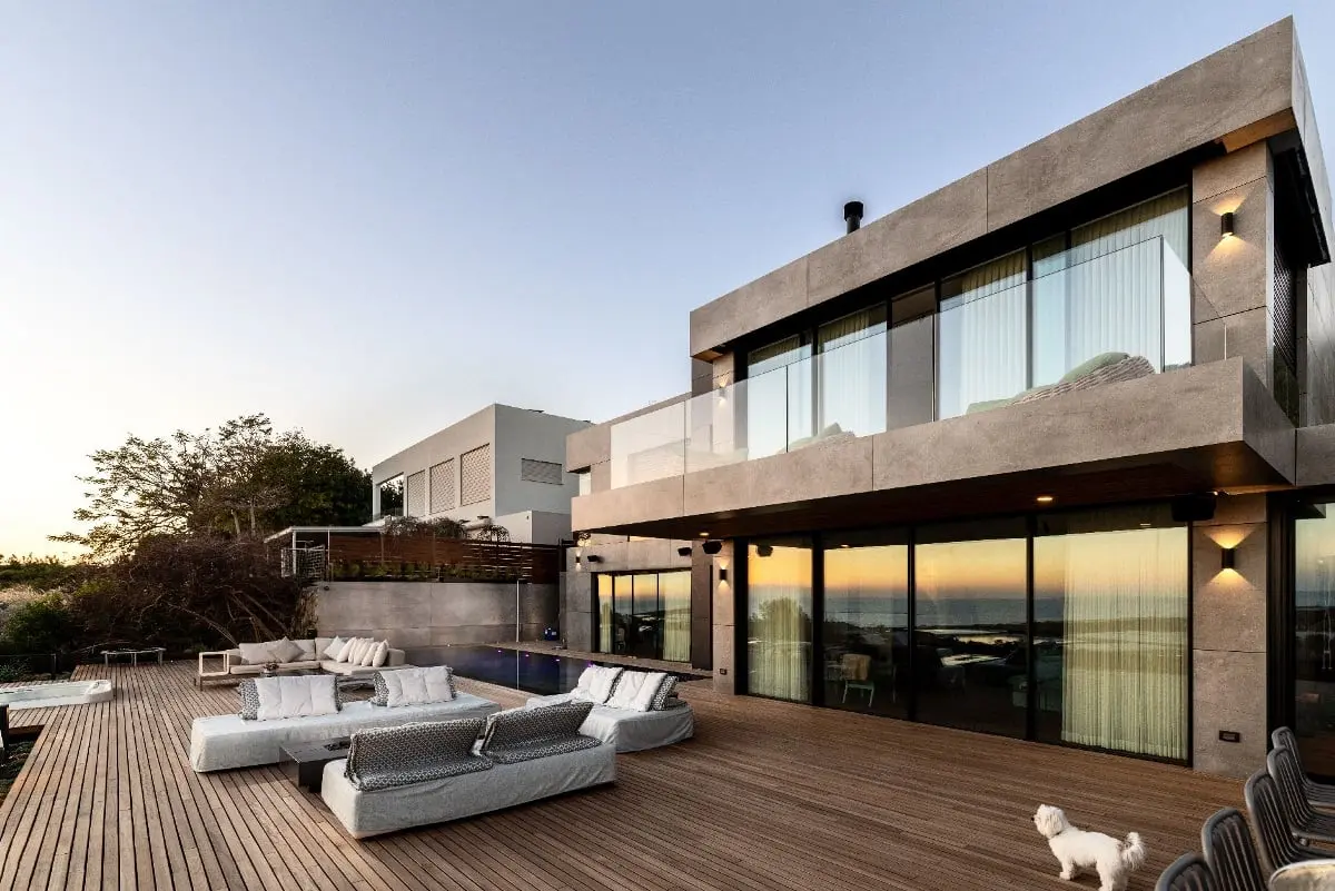 Widoki na morze z willi położonej na północy Izraela, przy samym wybrzeżu Morza Śródziemnego, są nieodłączną częścią prezentowanego domu i elementem łączącym wnętrze z otaczającą go przyrodą. Autor projektu Moshe Zion pragnął płynnie wkomponować bryłę budynku w nadmorski krajobraz. Właśnie dlatego postawił na materiały wykończeniowe, które nawiązują do naturalnych tekstur. Zastosowanie wielkopowierzchniowych płyt zainstalowanych na aluminiowej konstrukcji sprawiło, że z jednej strony willa zyskała nowoczesny wygląd, a z drugiej idealnie wpisała się w przestrzeń. W celu osiągnięcia kontrastu pomiędzy chłodem materiałów, wyglądem betonu oraz szkła i ciepłem drewna, architekt postawił na użycie różnych płaszczyzn i odcieni spieków. W rezultacie patrząc na dom z zewnątrz, bryła przestaje być monolityczna, a całość tworzy na fasadzie wrażenie dynamicznego ruchu. Renowacja całej elewacji z pomocą płyt wielkoformatowych jest prawdopodobnie jednym z najbardziej efektownych wizualnie rozwiązań, pozwalających na przekształcenie domu bez znaczącej zmiany jego wewnętrznej struktury. W przypadku willi Rosh Hanikra wynik jest spektakularny, a całość wygląda jak nowo wybudowany dom.