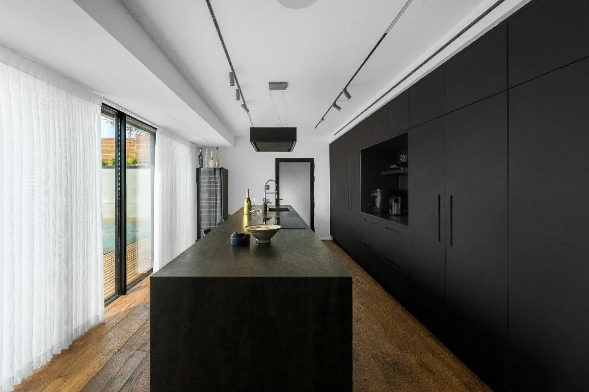 Wybór materiału przypominającego beton, tworzy w efekcie bardzo industrialny i nowoczesny wygląd. Duże tarasy z drewnianymi podłogami i szklanymi balustradami stanowią doskonały kontrapunkt dla „zimnej” w odbiorze, minimalistycznej szarości. Przestronny taras z pięknym widokiem, prowadzi wprost do otwartej kuchni. Tutaj postawiono na nowoczesny i minimalistyczny look w kolorach black&white. Pomieszczenie posiada imponującą wyspę wykonaną ze spieków kwarcowych, która wprost zaprasza do niespiesznego celebrowania chwil z gośćmi i domownikami.