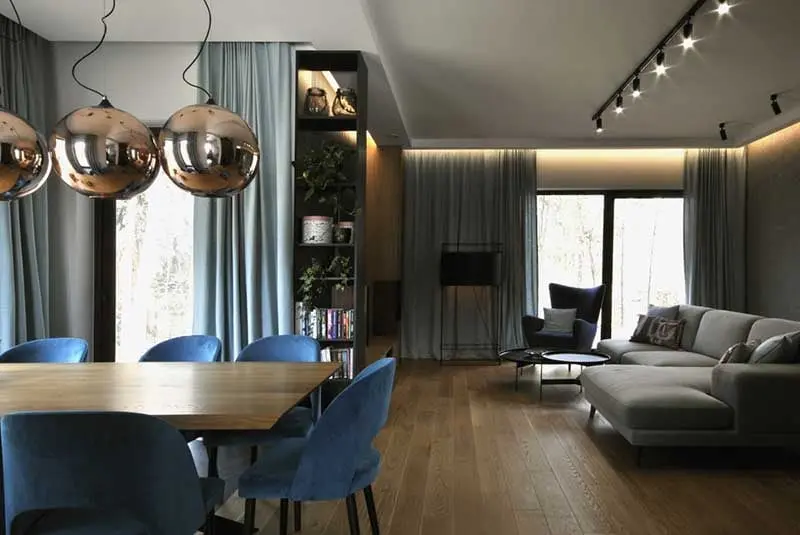 Inwestorzy marzyli o domu, który będzie dostosowany do potrzeb całej rodziny. Poza stworzeniem przestrzeni do wspólnego spędzania czasu oraz oddzielnych pokoi dla każdego z domowników, miało tu być przede wszystkim przytulnie. Jednak jasno określono, że zastosowana paleta barwna ma być ciemna z wykorzystaniem naturalnych materiałów. Architekt Piotr Stolarek idealnie poradził sobie z wytycznymi właścicieli i spełnił ich wszystkie oczekiwania. Zaproponował aranżację w której dominuje czerń, grafit i biel, przełamana całym spektrum odcieni błękitu. Natomiast duża ilość drewna, miękkiego weluru oraz oświetlenia o ciepłej temperaturze barwowej wprowadziło do wnętrza pożądany faktor przytulności. Zajrzymy więc do doskonale urządzonej rodzinnej enklawy w Józefowie.
