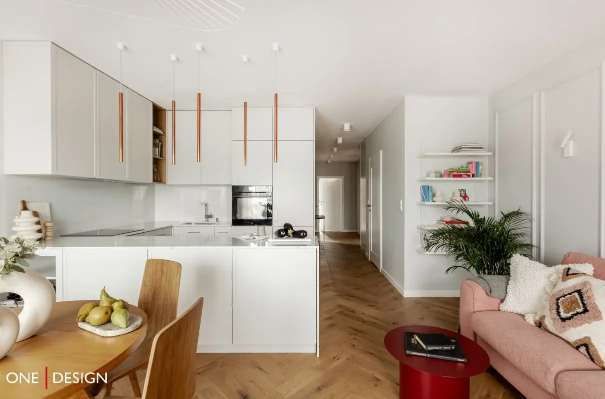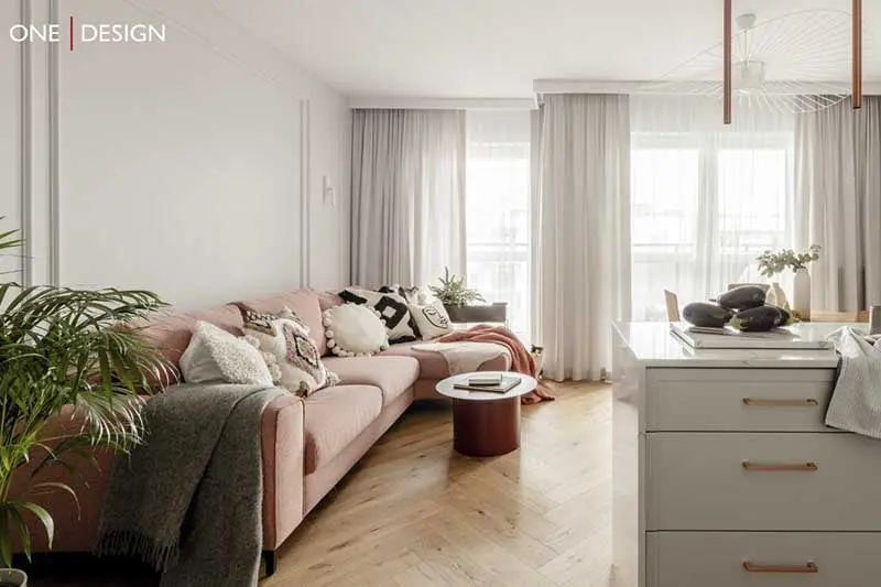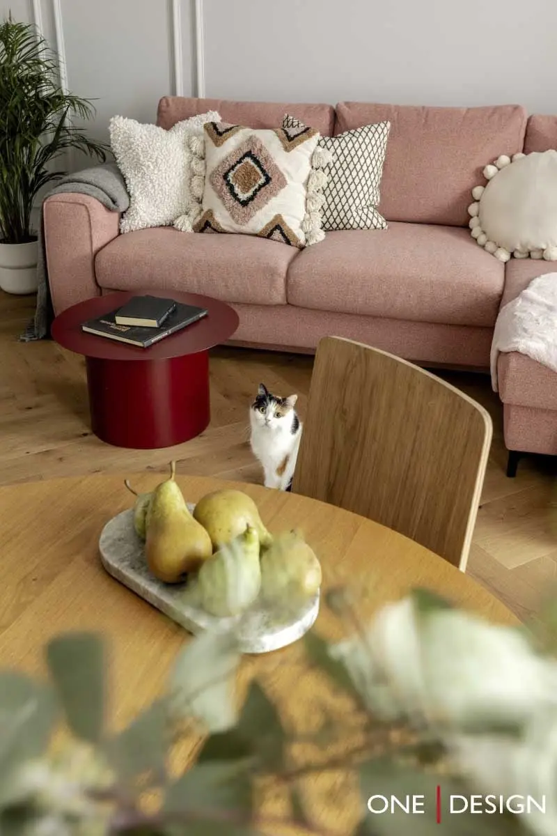 Aranżacja przestrzeni dziennej stanowi romans eklektyzmu z estetyką boho. Architekci postawili na białe ściany, ozdobione prostymi listwami sztukateryjnymi. Aneks kuchenny w literę U, został subtelnie oddzielony od salonu za sprawą wyspy. Jednocześnie biała zabudowa i gładkie fronty powodują, że część ta wtapia się w przestrzeń salonu. Ciekawym akcentem dekoracyjnym są miedziane uchwyty szafek, do których nawiązują oprawy wiszące w formie rurek, umieszczone nad blatem wyspy. Narożnik w odcieniu pastelowego różu, króluje na jasnym tle. Ozdobiony poduchami w klimacie boho, stanowi centralny punk strefy dziennej. Ciekawym akcentem barwnym, jest dobrany do sofy wiśniowy stolik kawowy, przełamujący cukierkową kolorystykę. Przytulną atmosferę wprowadza drewno, pod postacią parkietu w jodełkę oraz stołu jadalnianego.