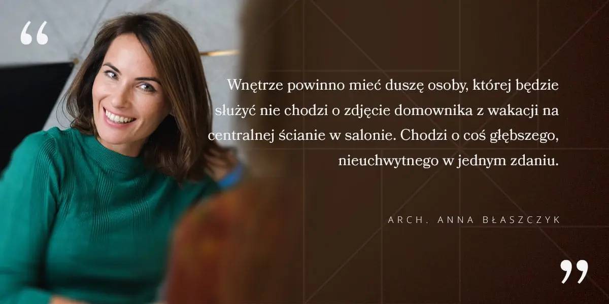 Anna Błaszczyk: Człowiek jest dla mnie najważniejszy. Staram się poznać jego potrzeby, styl życia, przyzwyczajenia, wartości i to kim jest, z jakimi problemami musi na co dzień się mierzyć i co wywołuje u niego radość, kiedy jest szczęśliwy. Miejsce naturalnie jest z nim powiązanie. Poza tym miejsce ma wpływ na wnętrze z kulturowej czy geograficznej perspektywy, inne projekty powstają w centrum miasta, a inne na jego obrzeżach, a jeszcze inne na wybrzeżu czy w Berlinie.
