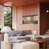Zaraz po przekroczeniu progu domu, zatapiamy się w otulających, miękkich i obłych liniach. Proste krawędzie zostały ograniczone do minimum, co poza podkreśleniem bajkowej atmosfery, ma również wymiar praktyczny – przestrzeń jest przyjazna małym dzieciom. Selekcja materiałów i kolorystyki jest bardzo mocno osadzona we współczesnych trendach. Dominuje tutaj ciepła, pastelowa tonacja z bazą w postaci pudrowego różu. Na tym tle pięknie wybrzmiewają akcenty terakoty, musztardowej żółci oraz jasne elementy oscylujące w kolorach złamanej bieli i piaskowego beżu. Zaproponowana kolorystyka świetnie rezonuje z organicznymi formami, stanowiącymi lejtmotyw całej aranżacji. Nie mogło tu również zabraknąć motywu łuku, który z jednej strony nadaje baśniowy klimat, a z drugiej podkreśla „miękkość” projektu. Przewijającym się przez wszystkie pomieszczenia akcentem są falujące linie. Odnajdziemy je w obrysach mebli, oryginalnym czarnym fotelu czy kształcie lustra łazienkowego, przywodzącego na myśl rozlaną krople wody. Motyw krągłości współgra również z estetyką retro, przemyconą do projektu w detalach. Jednocześnie nie można oprzeć się wrażeniu, że we wnętrzach słychać echa stylu Memphis Group, wyrażające się w nieoczywistych kontrastach kolorystycznych, obłych bryłach oraz motywach kuli.