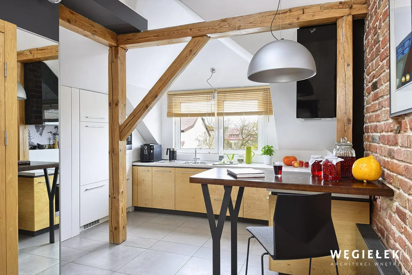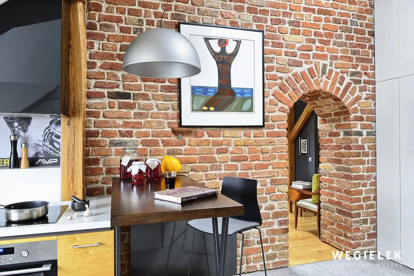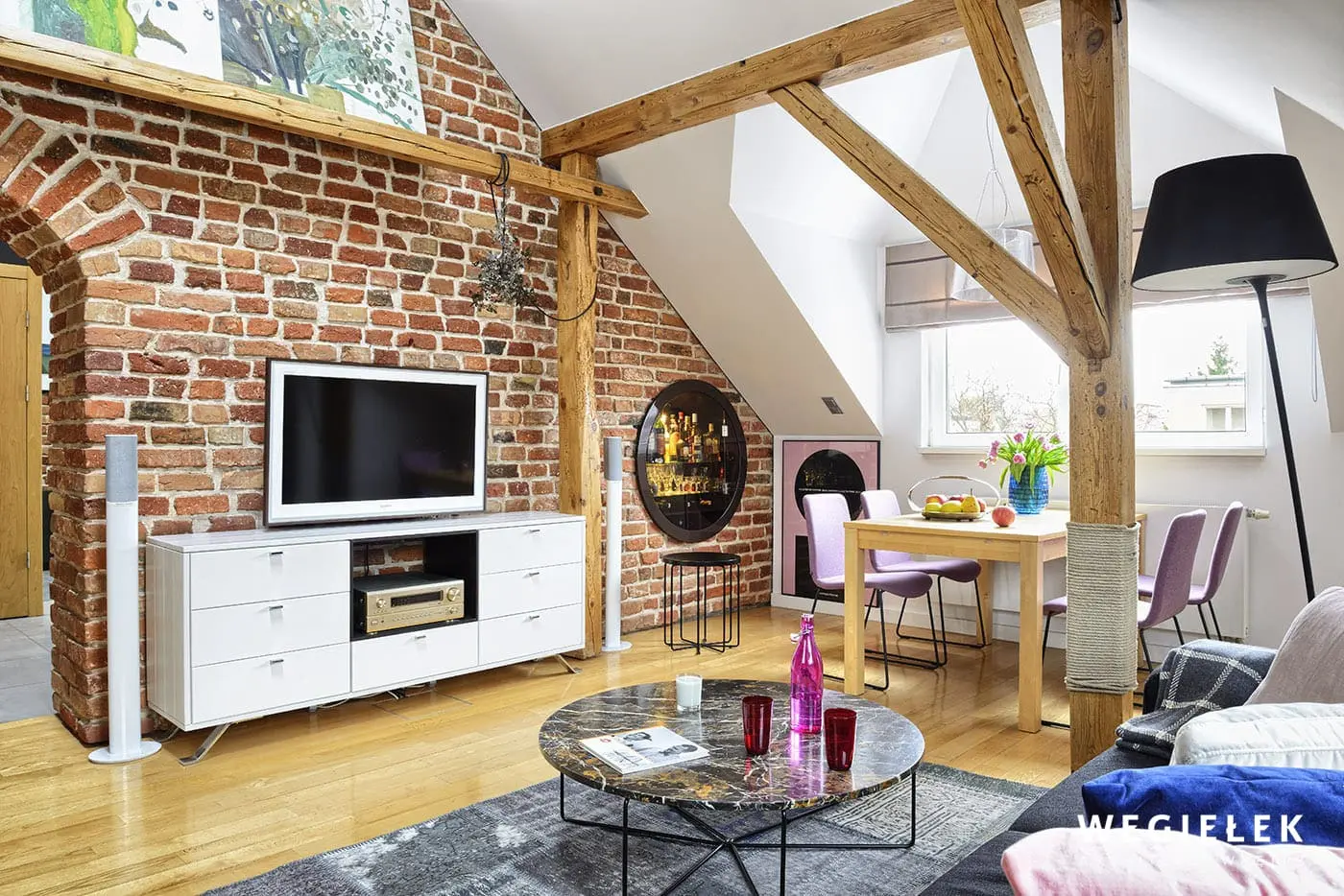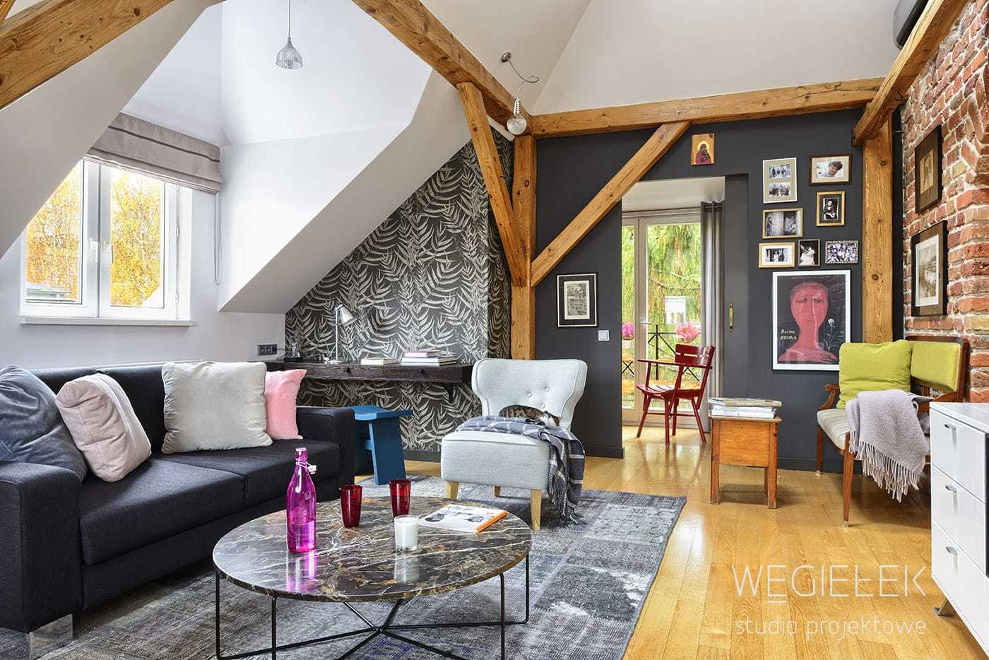 Projektanci z pracowni Węgiełek Architekci Wnętrz zaaranżowali 65 metrów poddasza, w którym czuć ducha przeszłości. Ta niekonwencjonalna przestrzeń daje szanse na wyjątkową aranżację , nietypowy wystrój i magiczny wynik. Oryginalne, odrestaurowane belki, ciekawe grafiki, kolorowe szkło i stara cegła wprowadza we wnętrza klimat dawnych lat przeplatający się z nowoczesnością.