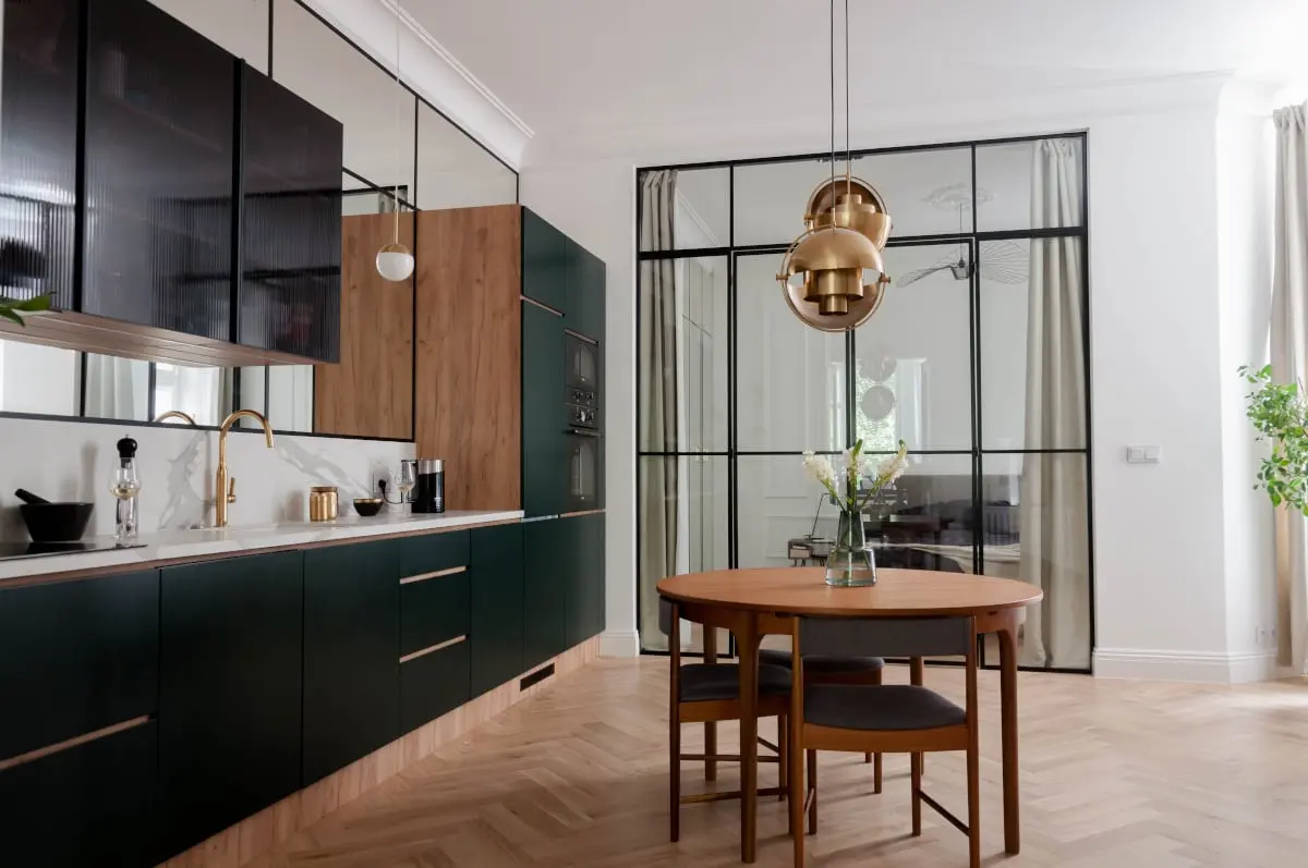 Neutralnym płótnem dla aranżacji tego mieszkania jest wszechobecna biel. Nowoczesnego sznytu wnętrzu nadają mocne kolory, które skutecznie ożywiają klasykę. Sercem domu jest kuchnia w kolorze nasyconej zieleni. Dopełnienie stanowi przytulne drewno i marmur. Złote akcenty obecne w całym mieszkaniu jeszcze bardziej uszlachetniają projekt.