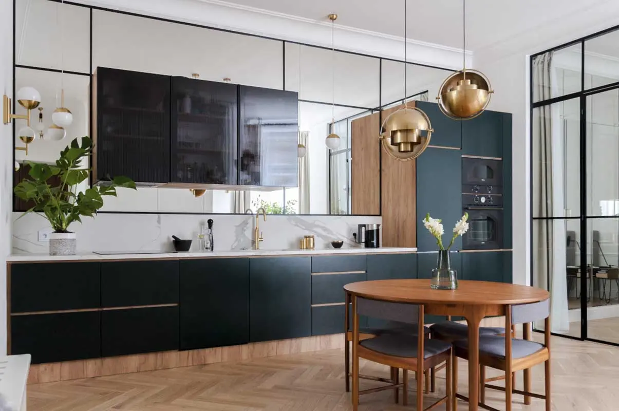Ciekawym zabiegiem projektowym jest ściana za kuchnią wykonana z geometrycznych podziałów lustra z czarnymi ramkami. Tak zaprojektowana ściana idealnie koreluje z loftowym przeszkleniem oddzielającym sypialnię od strefy dziennej apartamentu.