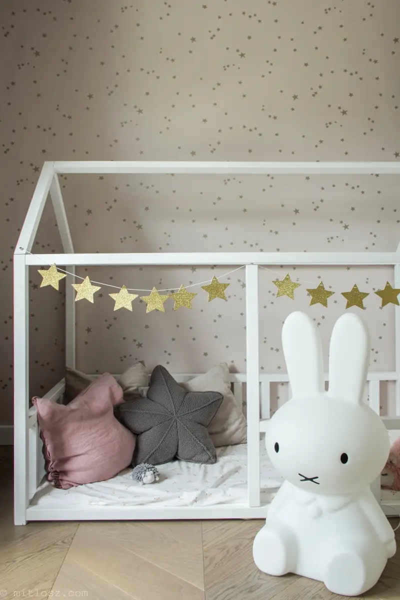 W pokoju dziecięcym nie zabrakło ukochanych motywów najmłodszej mieszkanki. Tapeta z gwieździstym wzorem, została umieszczona za łóżeczkiem w formie domku. Po przeciwległej stronie zorganizowano zabudowę z wieloma miejscami do przechowywania oraz miejscem na siedzisko. Dla tego pokoju, architektka wybrała kolor niebieski w odcieniu denim, a towarzyszy mu brudny, jasny róż.