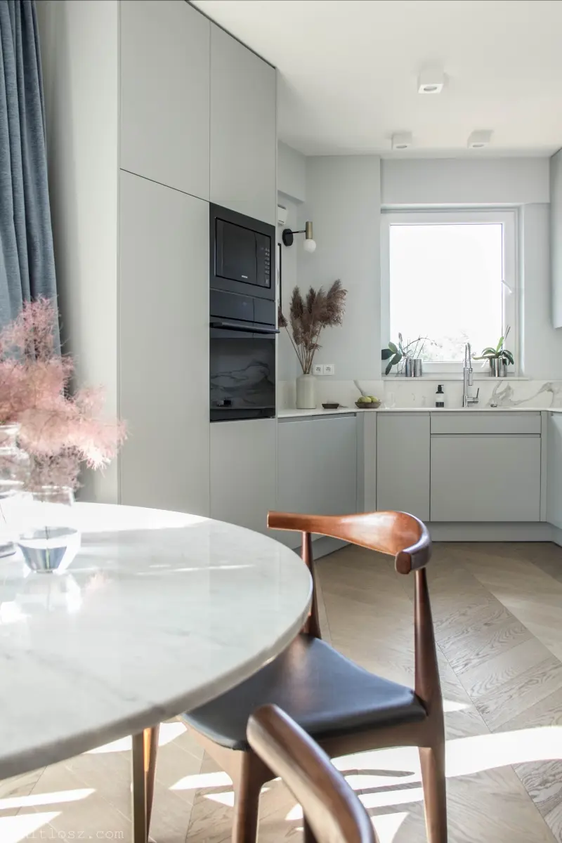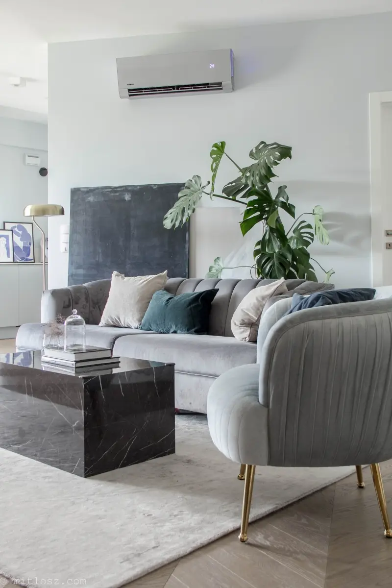 Zgodnie z marzeniem inwestorów, Nadia Mitłosz wykorzystała w aranżacji wnętrza zimne barwy: od szarości, szaro-niebieskiego, classic blue, rozbielonego błękitu po szmaragdowy. Niemal od razu przychodzą na myśl skojarzenia z odcieniami, jakie wyróżniają się z morskiej toni. Towarzystwem dla tych szlachetnych kolorów jest marmur. Architektka postawiła na jego rożne rodzaje i kolory. Stolik kawowy w formie kubika wykonany jest z czarnych płyt o białych żyłkach. Okrągły blat stołu jadalnianego to biały marmur, natomiast w kuchni pas nad blatem wykonany jest z płyt o teksturze białego kamienia z kontrastowymi i grubymi szarymi żyłami. Dość surową selekcje materiałów i barw zaproponowaną przez inwestorów, należało złagodzić i ocieplić. Zadanie to świetnie spełnia drewno w wybarwieniu orzecha, które występuje na krzesłach jadalnianych i komodzie. Akcentem dekoracyjnym są złote elementy: podstawa stołu, oświetlenie, nóżki fotela i konsola w holu.