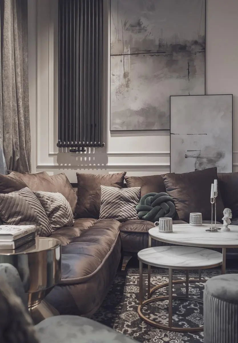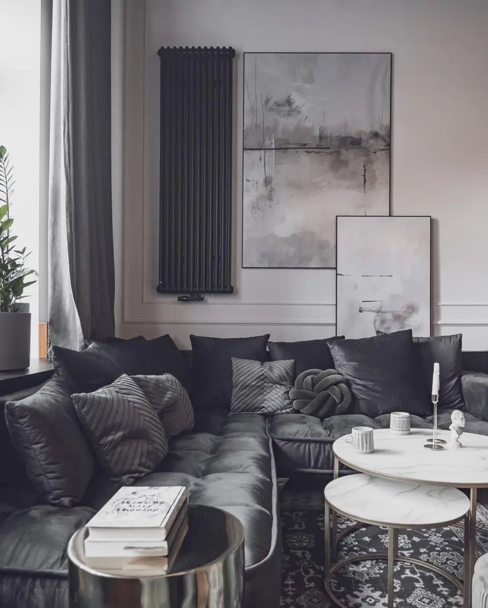 Nie zabrakło tu miejsca na uniwersalną szarość połączoną z ocieplającymi materiałami, takimi jak drewno i tekstylia. Dodatkowym elementem przełamującymi styl loftowy jest wyposażenie, między innymi kanapa z dodatkowymi poduchami czy też dywan.