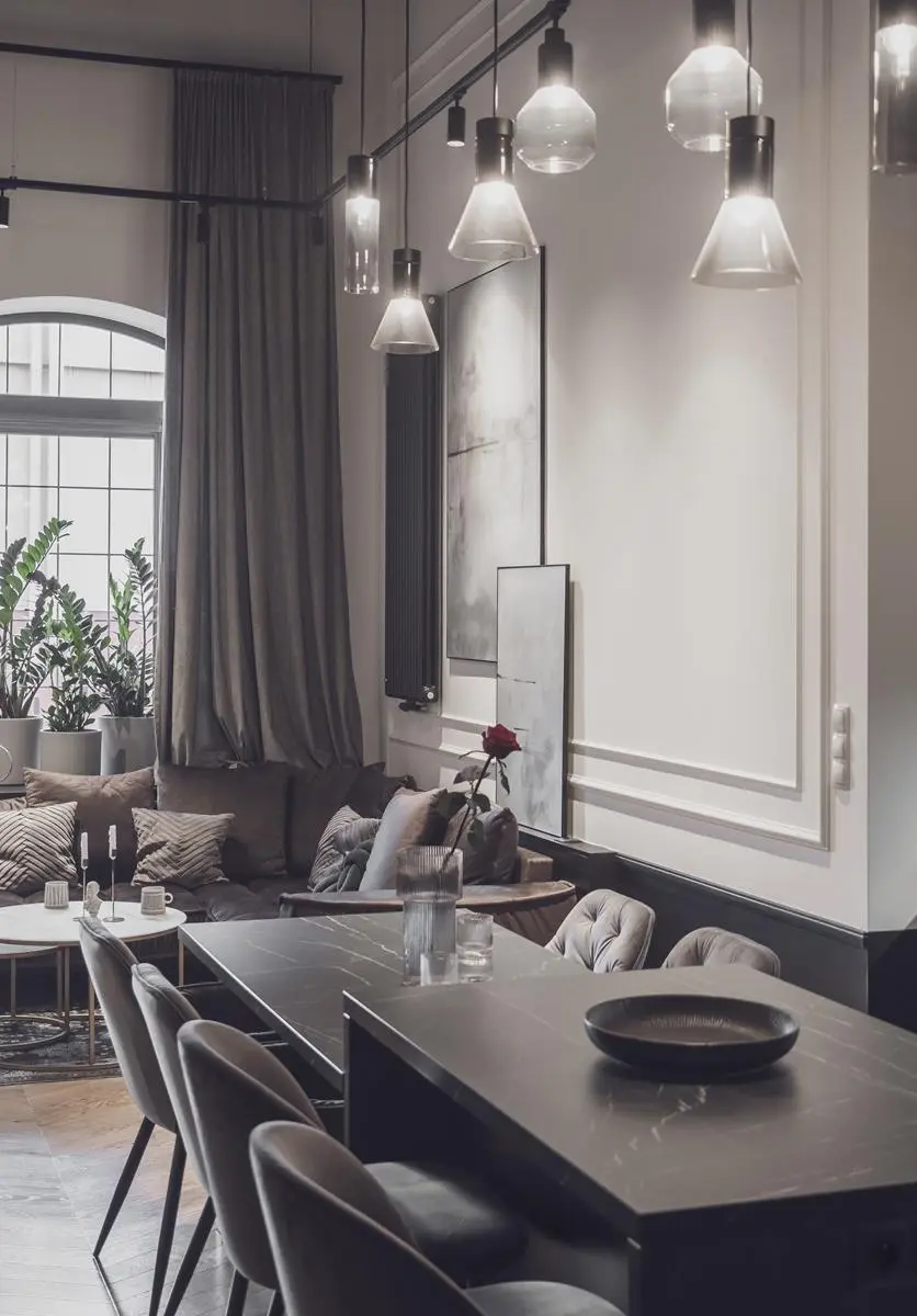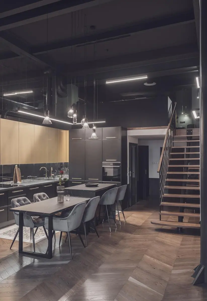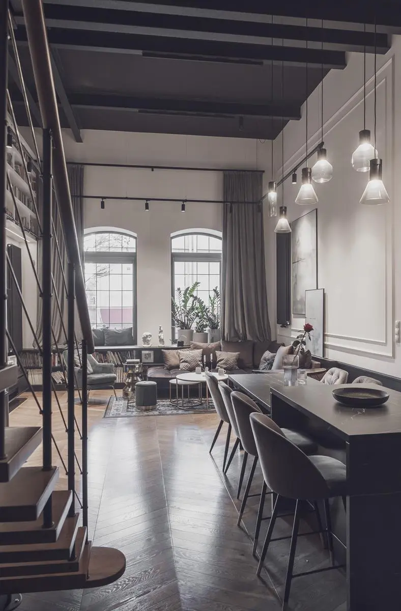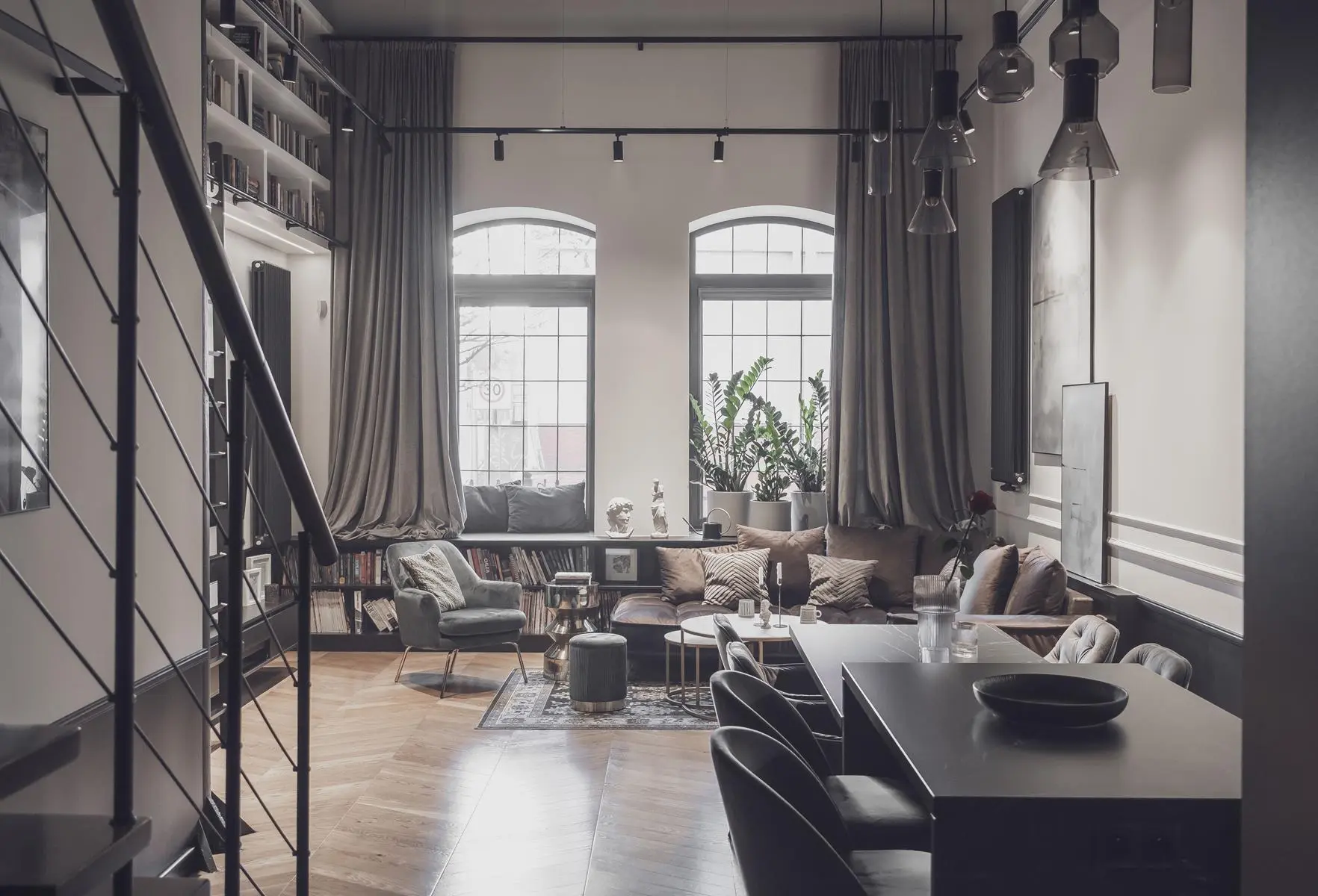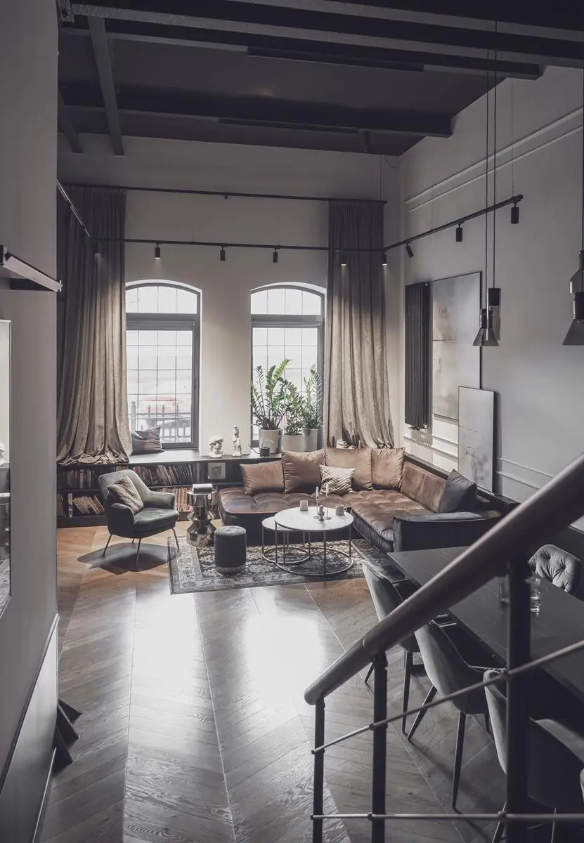 Osiemdziesięciodwumetrowe wnętrze zaprasza przede wszystkim industrialnym klimatem, który został wzbogacony złotymi dodatkami. Istotną rolę w tym klimatycznym mieszkaniu grają takie materiały wykończeniowe jak dębowa jodełka francuska, idealnie odbijająca światło naturalne, sztukateria ścienna, a także stal konstrukcyjna i dekoracyjny blask dodatków. Surowy, techniczny styl łączy się tutaj z elegancją gustownych wnętrz.