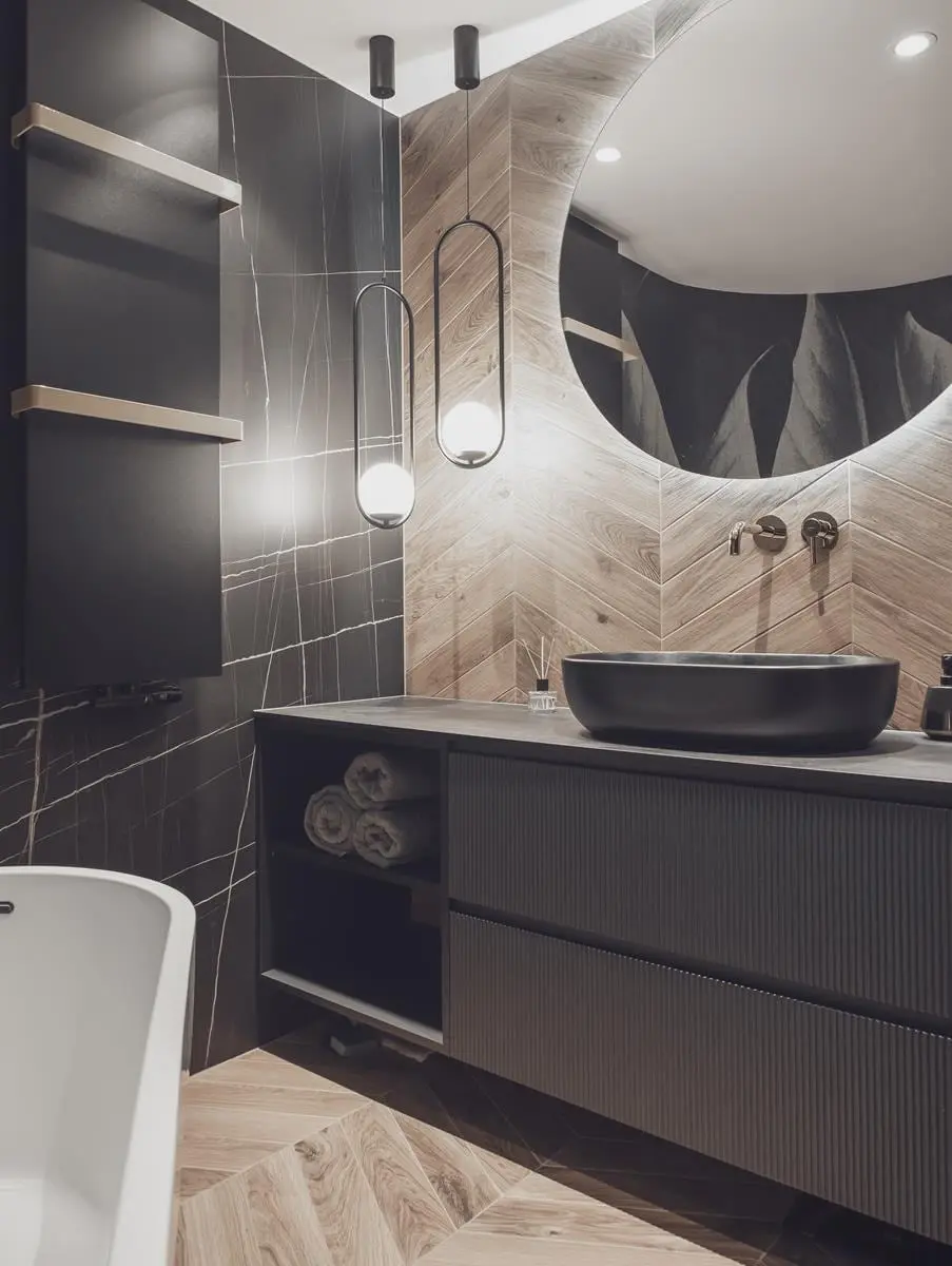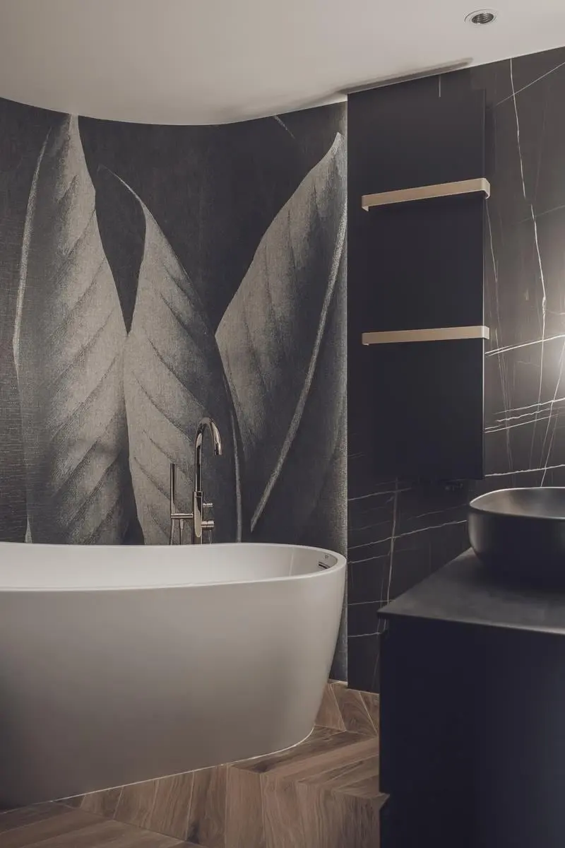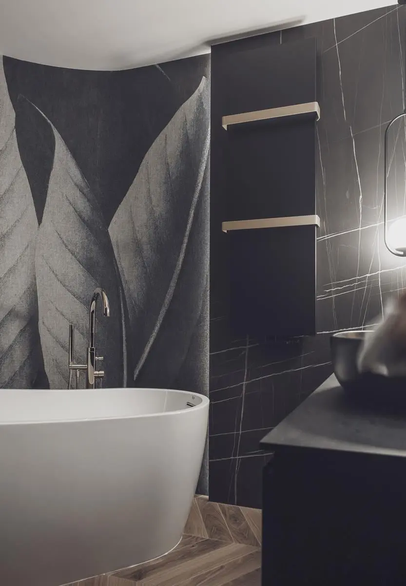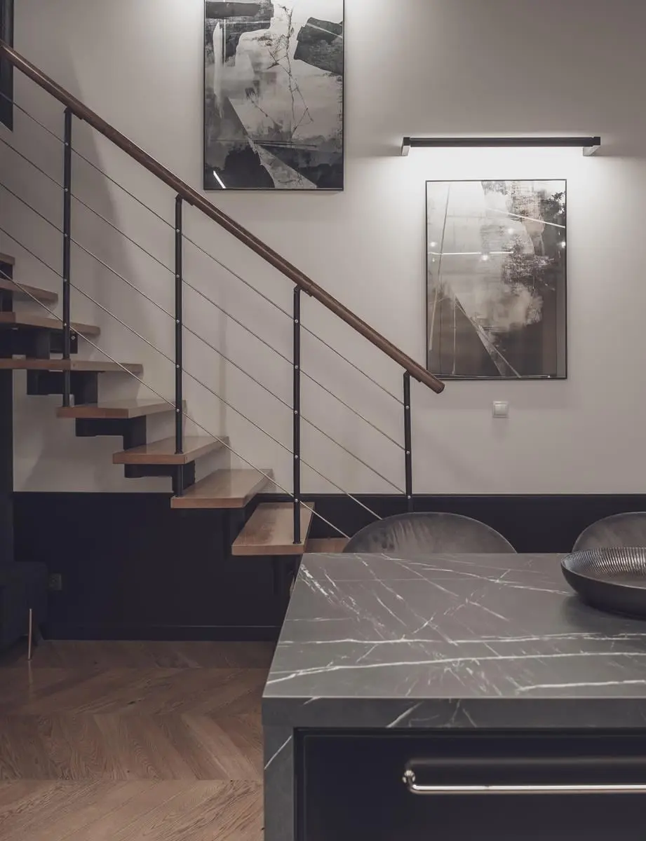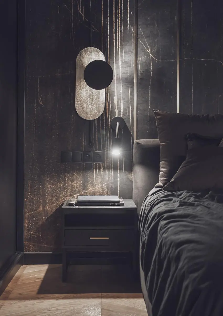 Osiemdziesięciodwumetrowe wnętrze zaprasza przede wszystkim industrialnym klimatem, który został wzbogacony złotymi dodatkami. Istotną rolę w tym klimatycznym mieszkaniu grają takie materiały wykończeniowe jak dębowa jodełka francuska, idealnie odbijająca światło naturalne, sztukateria ścienna, a także stal konstrukcyjna i dekoracyjny blask dodatków. Surowy, techniczny styl łączy się tutaj z elegancją gustownych wnętrz.
