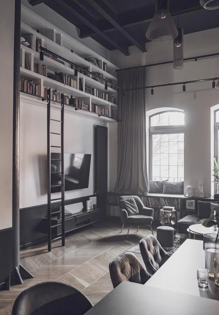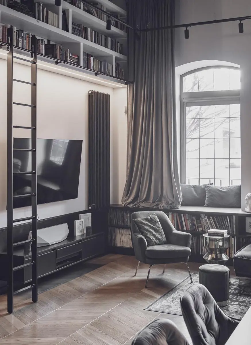 Niezwykle dekoracyjnym elementem tego projektu jest biblioteczka umieszczona prawie pod sufitem. To doskonała przestrzeń na liczne książki właścicieli, których ciągle przybywa, ale również ciekawy zabieg aranżacyjny, który podkreśla wysokość wnętrza. Oryginalnym elementem w tej konstrukcji jest oczywiście drabina, dzięki której użytkownicy mieszkania mogą dostać się do wszystkich pozycji czytelniczych. Reszta lektur właścicieli znajduje się w drugiej biblioteczce, która została połączona z głębokim parapetem, będącym jednocześnie komfortowym siedziskiem.