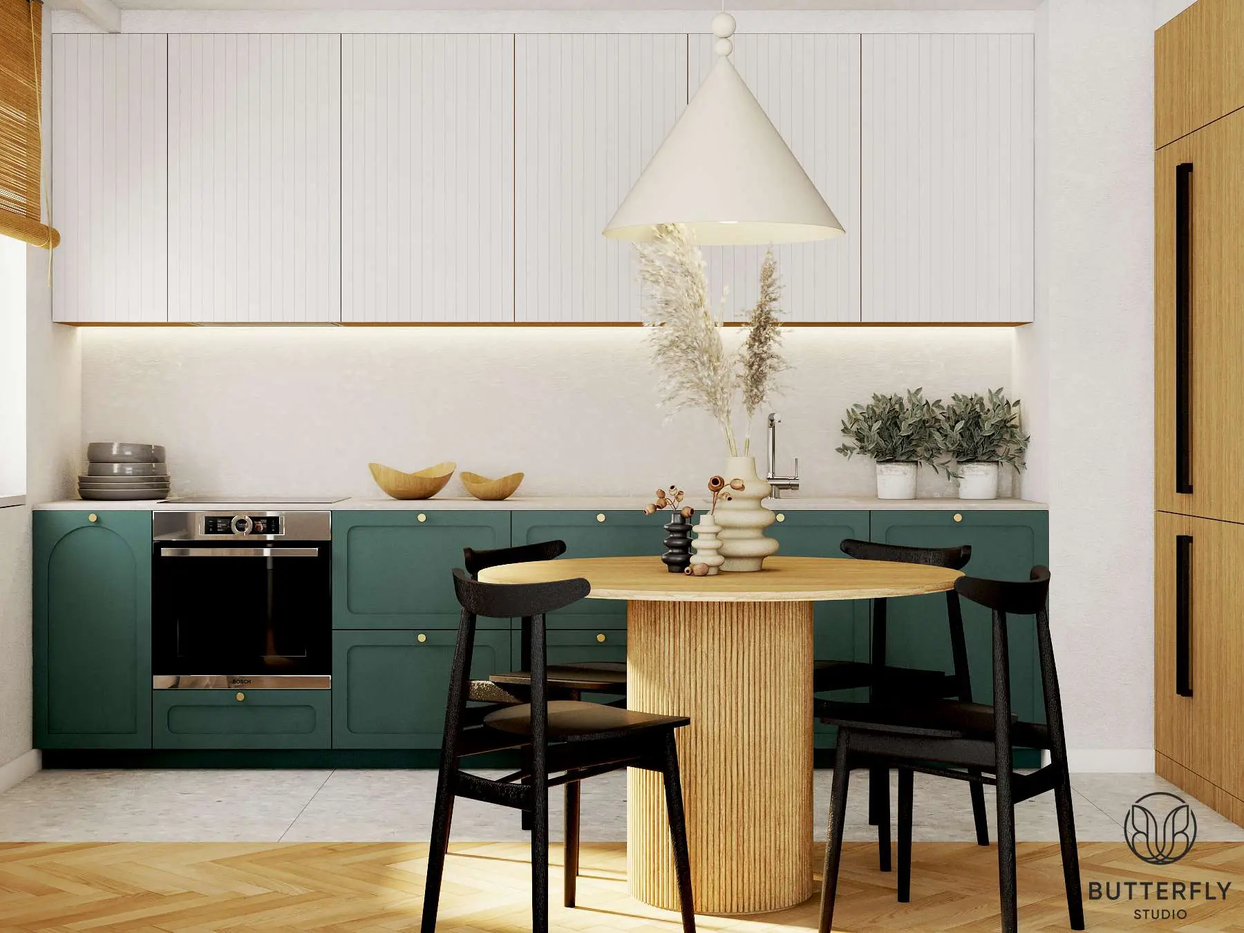 Kuchnia otwarta na jadalnię oraz salon tworzy funkcjonalny, przejrzysty obraz. Ciekawą koncepcją aranżacyjną jest zastosowanie szafek w dwóch kolorach, dolne w ciemnej soczystej zieleni i górnych w białym kolorze. Dzięki temu zabiegowi aranżacja jest lekka, gdyż białe szafki praktycznie są niewidoczne i nie przytłaczają przestrzeni. Na podłodze przy szafkach ułożono szare płytki imitujące kamień, które w subtelny sposób łączą się z drewnianą podłogą ułożoną we francuską jodełkę. Wyznaczają w ten sposób podział pomieszczenia na strefy. Całość dopełniają skrupulatnie dobrane, nowoczesne lampy o minimalistycznej formie.