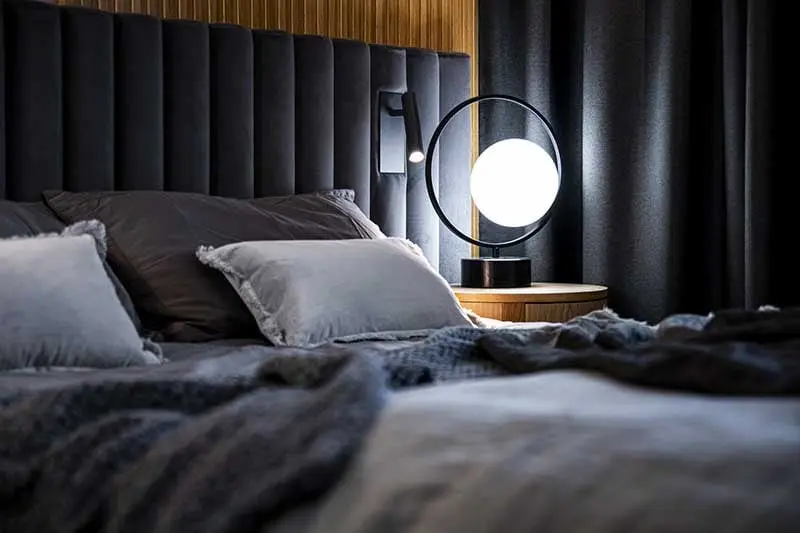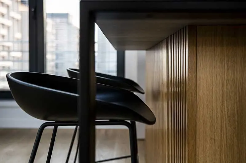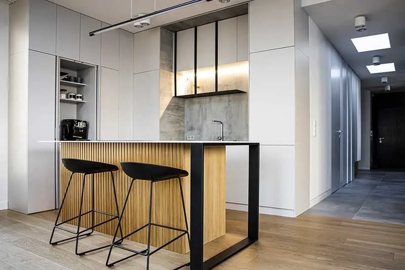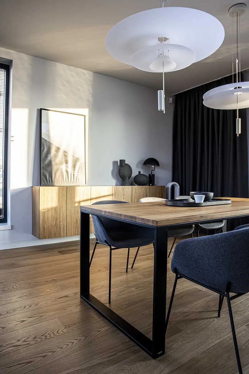 Apartament został zaprojektowany jako minimalistyczna baza wzbogacona dodatkami i wykonanymi ze szlachetnych materiałów meblami na indywidualne zamówienie. Chłodny, betonowy salon, połączony z kuchnią został ocieplony drewnianymi elementami oraz tapicerowanymi meblami w głębokich kolorach. Całość dopełniają designerskie lampy.