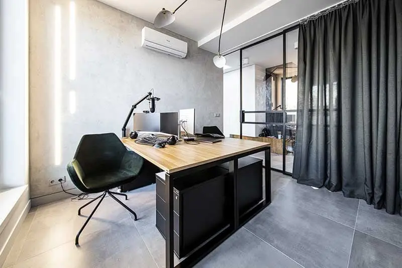 W mieszkaniu znajduje się także biuro Właścicieli, wydzielone od części prywatnej przy pomocy szklanych, przesuwanych drzwi w stalowej ramie, także wykonanych na indywidualne zamówienie.
