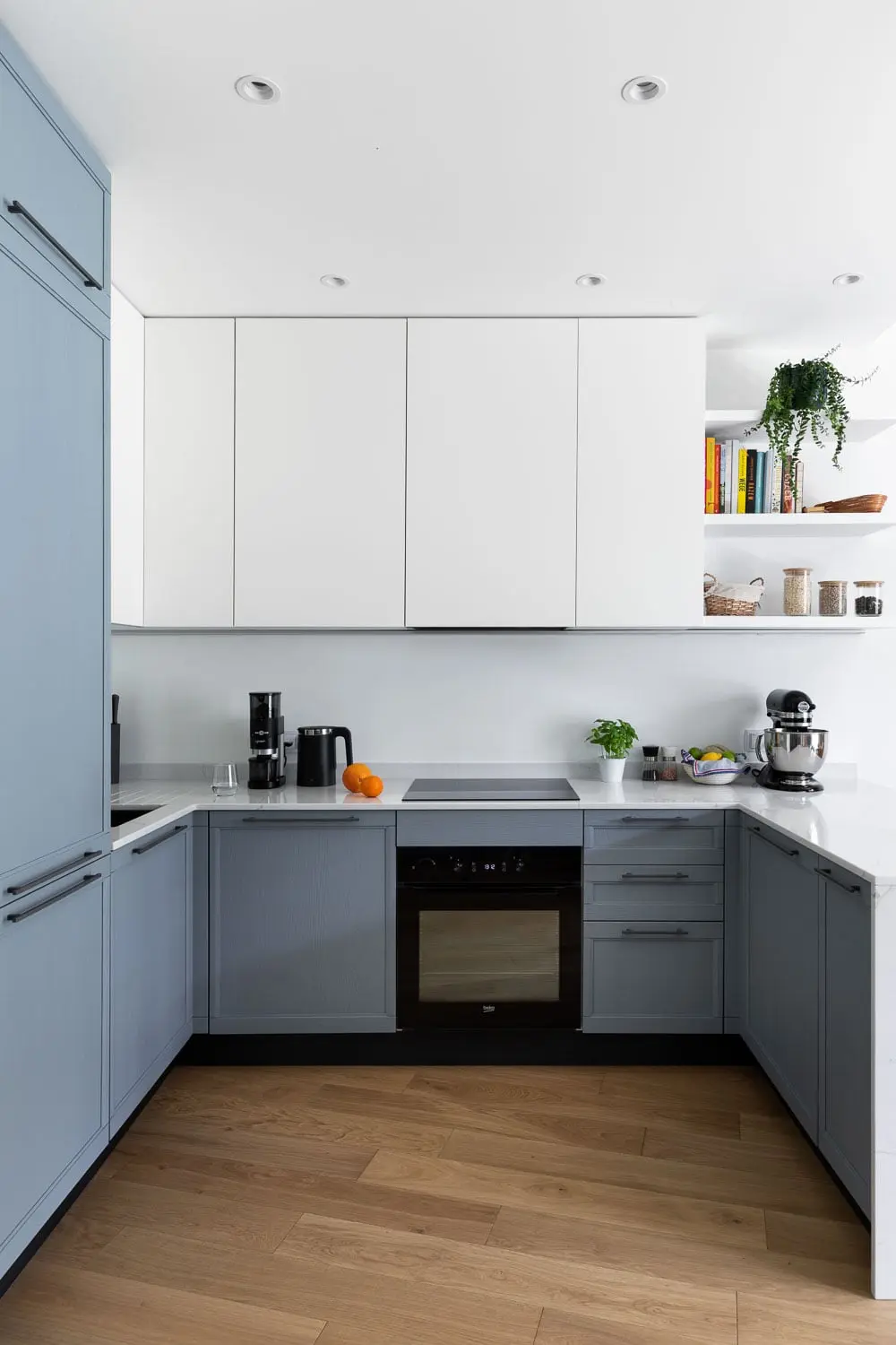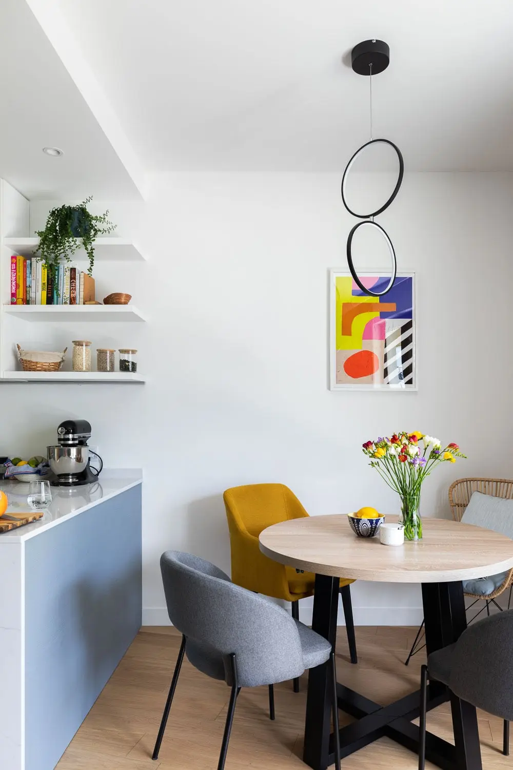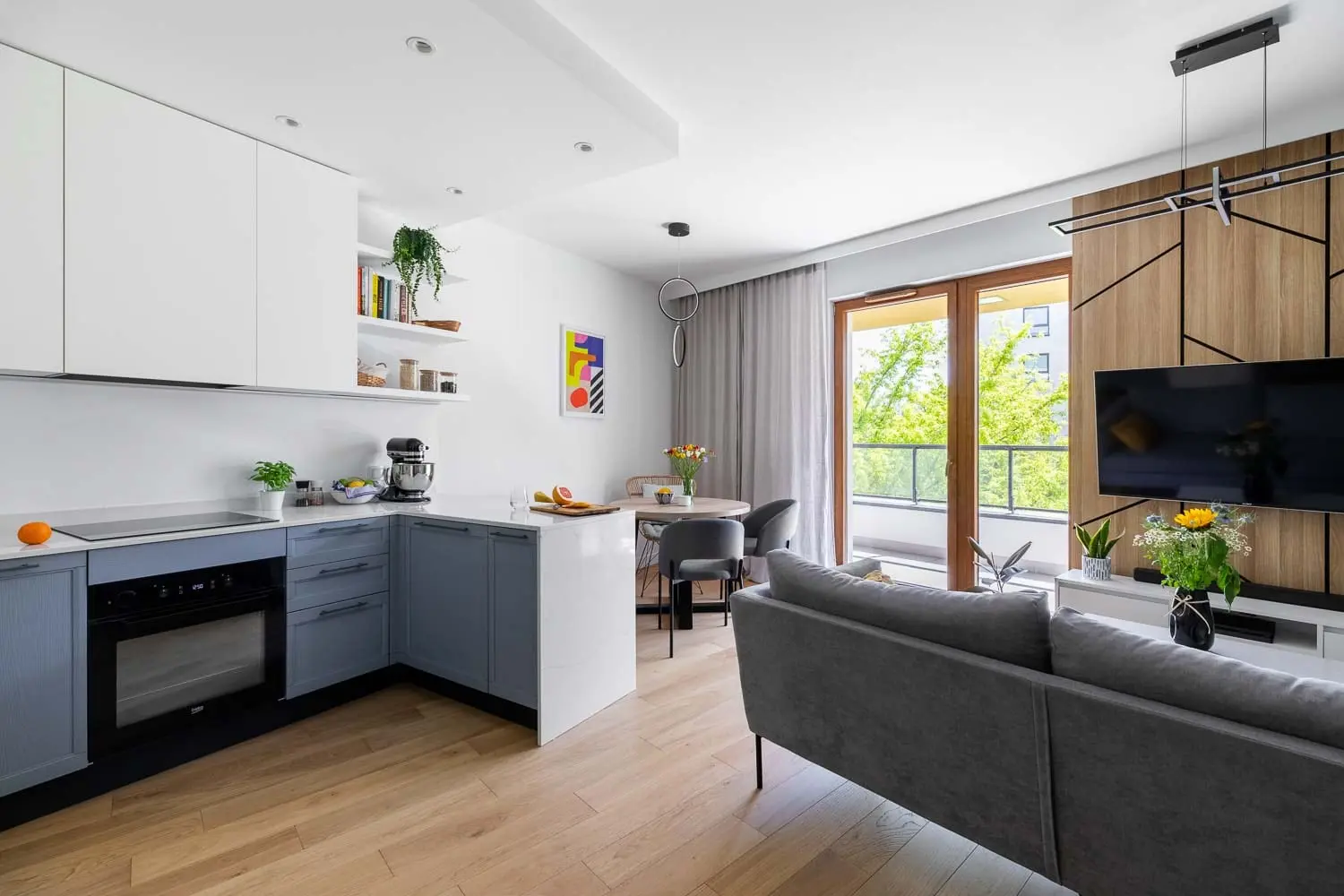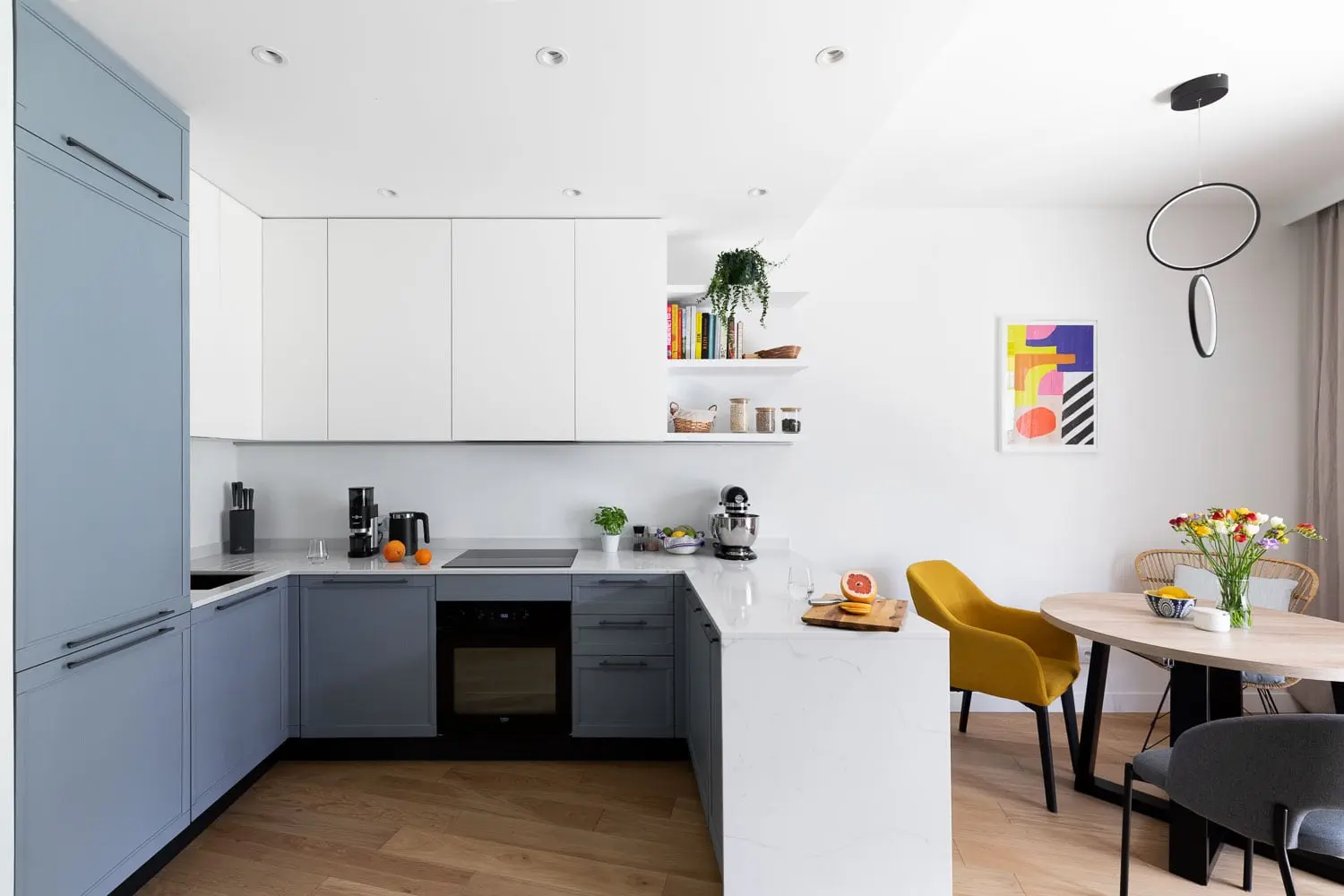 Naprzeciwko domowej biblioteki znajduje się bajecznie błękitna kuchnia. Fronty w kolorze bezchmurnego nieba korespondują z identycznym odcieniem równoległej ściany, dzięki czemu zyskujemy poczucie jedności i spójności całego pomieszczenia. Kącik jadalniany znajduje się bezpośrednio za półwyspem kuchennym. Zastosowanie trzech różnych typów krzeseł przy jednym stole w niekonwencjonalny sposób urozmaica aranżację. Dodatkową atrakcją pomieszczenia bez wątpienia jest ściana za telewizorem wykonana z dociętych do kształtu, laminowanych płyt.