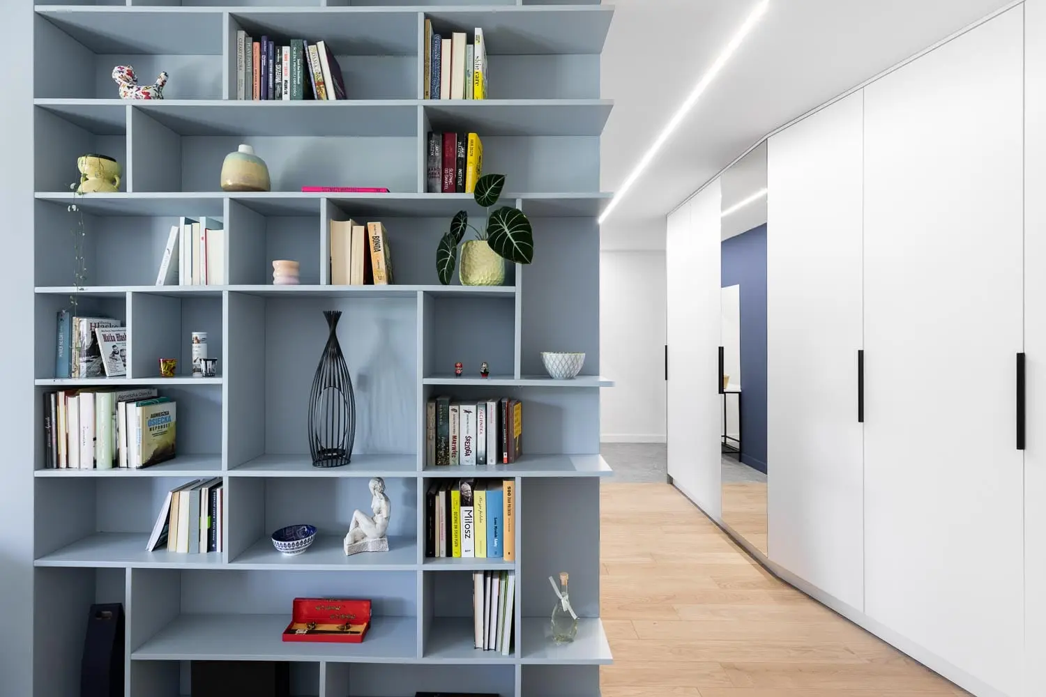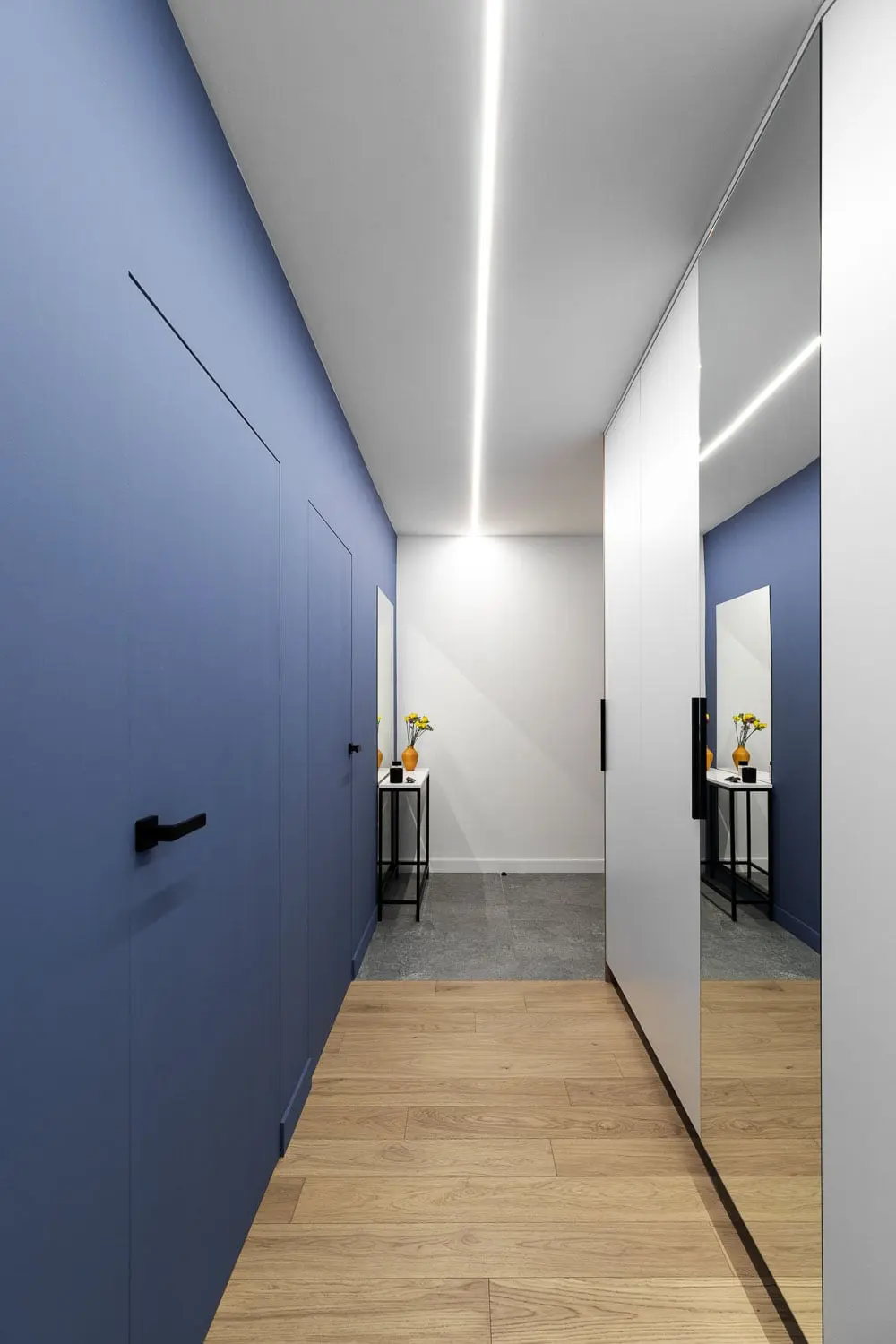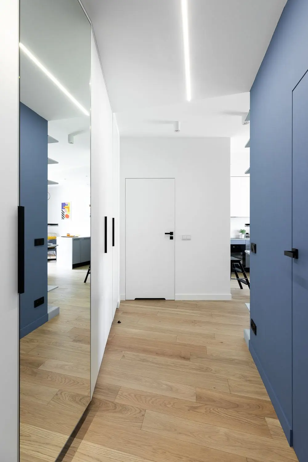 W przedpokoju dominuje minimalizm i czystość formy. Pomalowane na kolor ściany drzwi z ukrytą ościeżnicą tworzą jednolitą, gładką powierzchnię, która nadaje wnętrzu nowoczesnego charakteru. Rolę oświetlenia pełni listwa LED, która prostą linią przecina oś sufitu podwieszanego i prowadzi do dalszej części mieszkania.