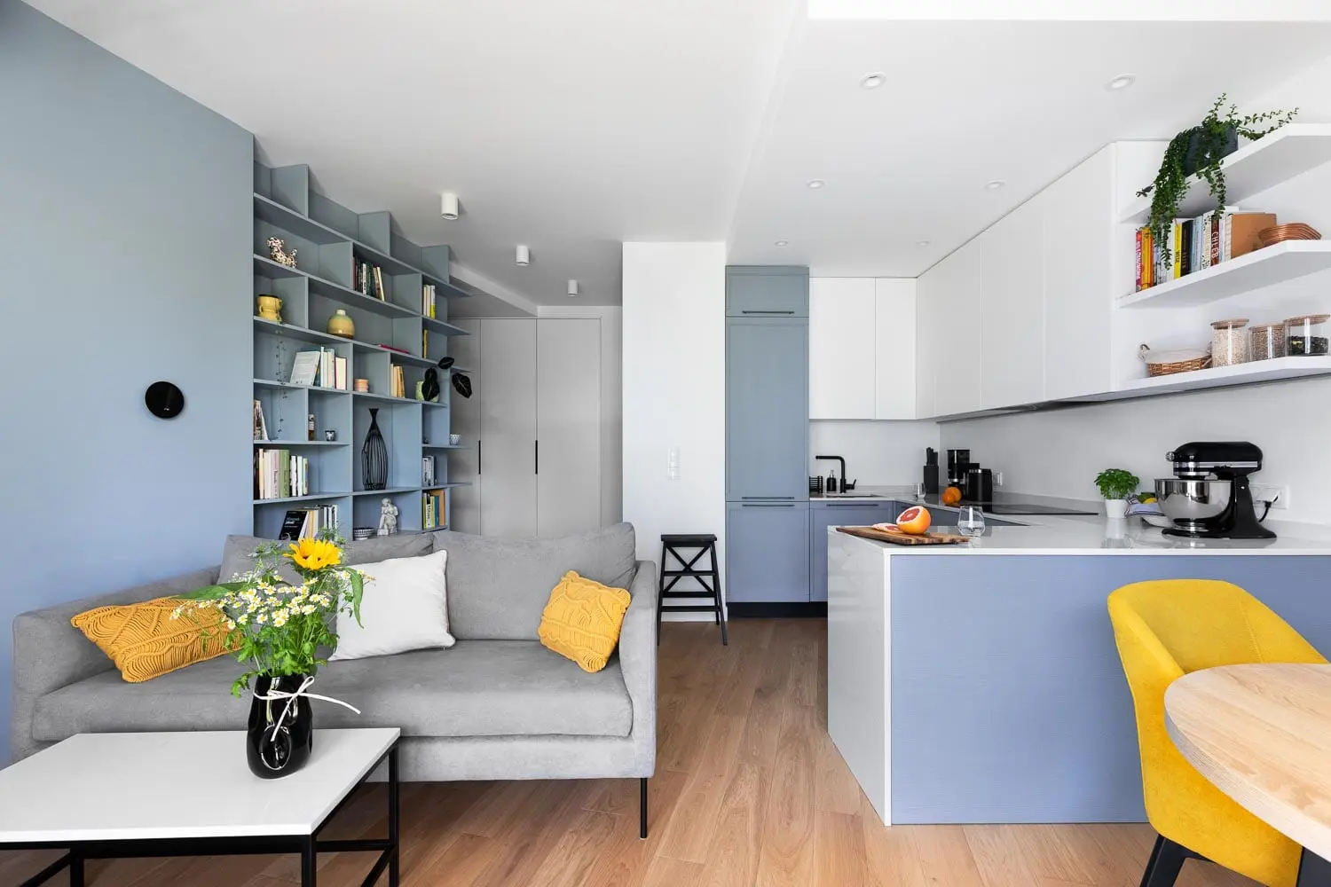 Lekkość, funkcjonalność i geometria – trzy kryteria, które przyświecały pracowni ATUT Architektura Wnętrz przy kreowaniu 49m2 przestrzeni, w której miała zamieszkać para miłośników gotowania i literatury. Strefą spajającą obie pasje domowników bez wątpienia jest salon z aneksem kuchennym. Serce pokoju dziennego stanowi monolityczny, wtopiony w ścianę regał z licznymi, nieregularnymi wnękami, które bez problemu pomieszczą obszerną kolekcję książek, zdjęć oraz ceramiki.