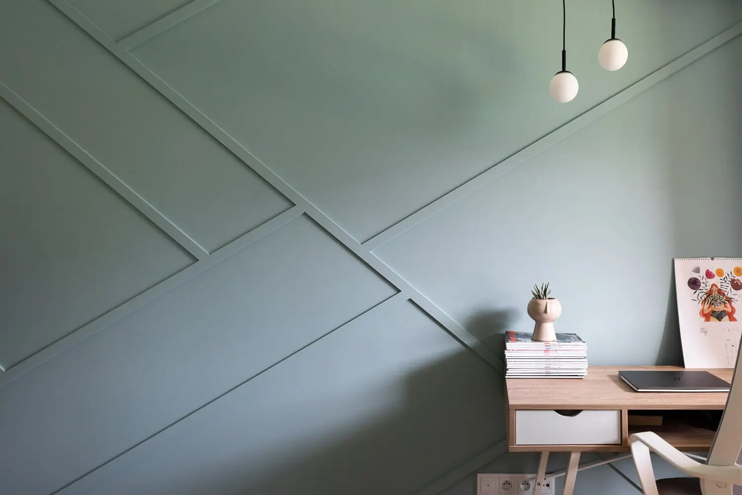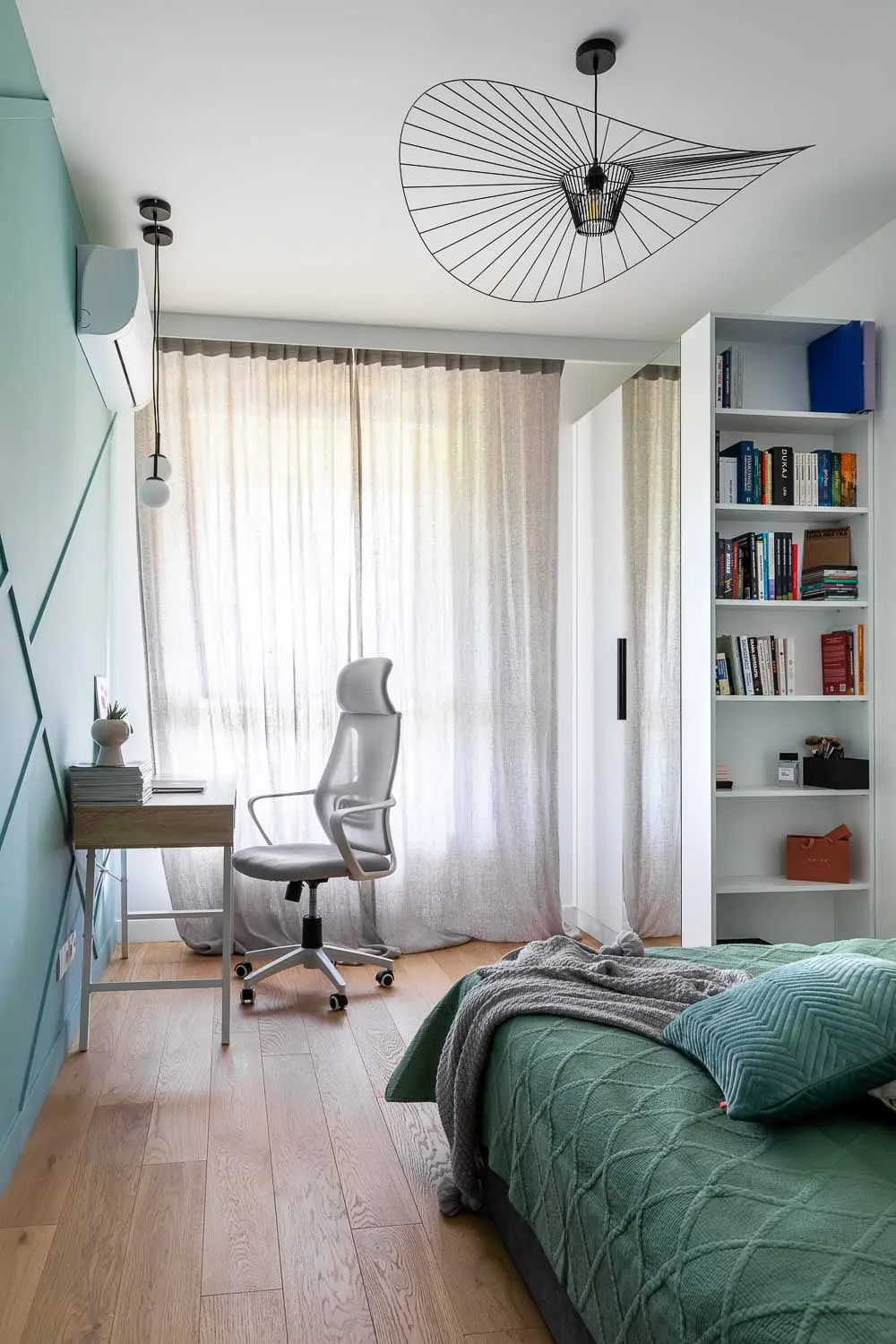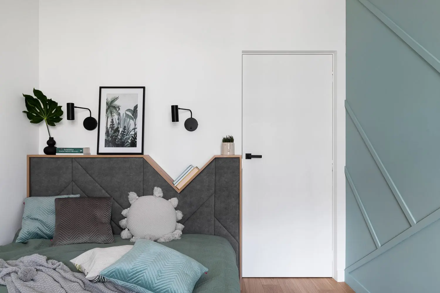 Motyw dynamicznych linii pojawia się także w sypialni. W nieregularny sposób przecinają całą ścianę, a dzięki zastosowaniu jednolitego koloru, subtelny rysunek wydobywany jest przez grę światła i cienia. Wzór skośnych linii został zastosowany również na wezgłowiu łóżka. Z uwagi na niewielkie gabaryty pomieszczenia, zagłówek pełni funkcję szafek nocnych. Pogłębiony blat służy nie tylko do odłożenia nocnej lektury, czy ekspozycji ozdób,