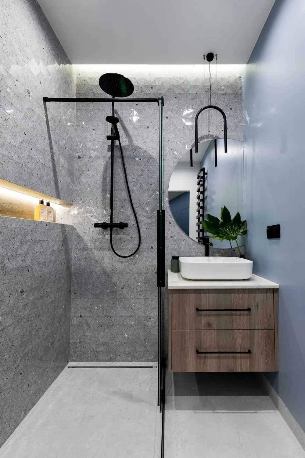 Kolorystyka łazienki jednoznacznie nawiązuje do strefy dziennej oraz aneksu kuchennego. Gładki błękit ścian i zabudowy meblowej płynnie łączy się z szarością strukturalnych płytek. Dużą atrakcję stanowi lustro, które zdaje się wnikać w ścianę. W łazience zaplanowano nie tylko oświetlenie użytkowe, lecz również niezależne światło klimatyczne doświetlające wnękę pod szafkami i rzucające subtelną poświatę zza sufitu podwieszanego.