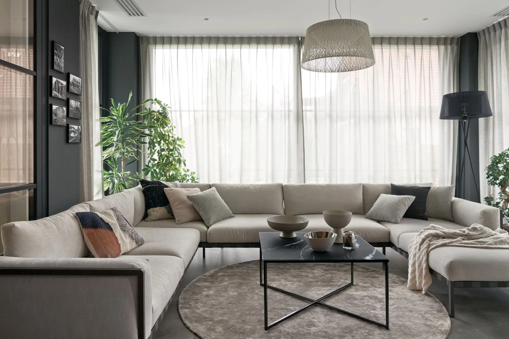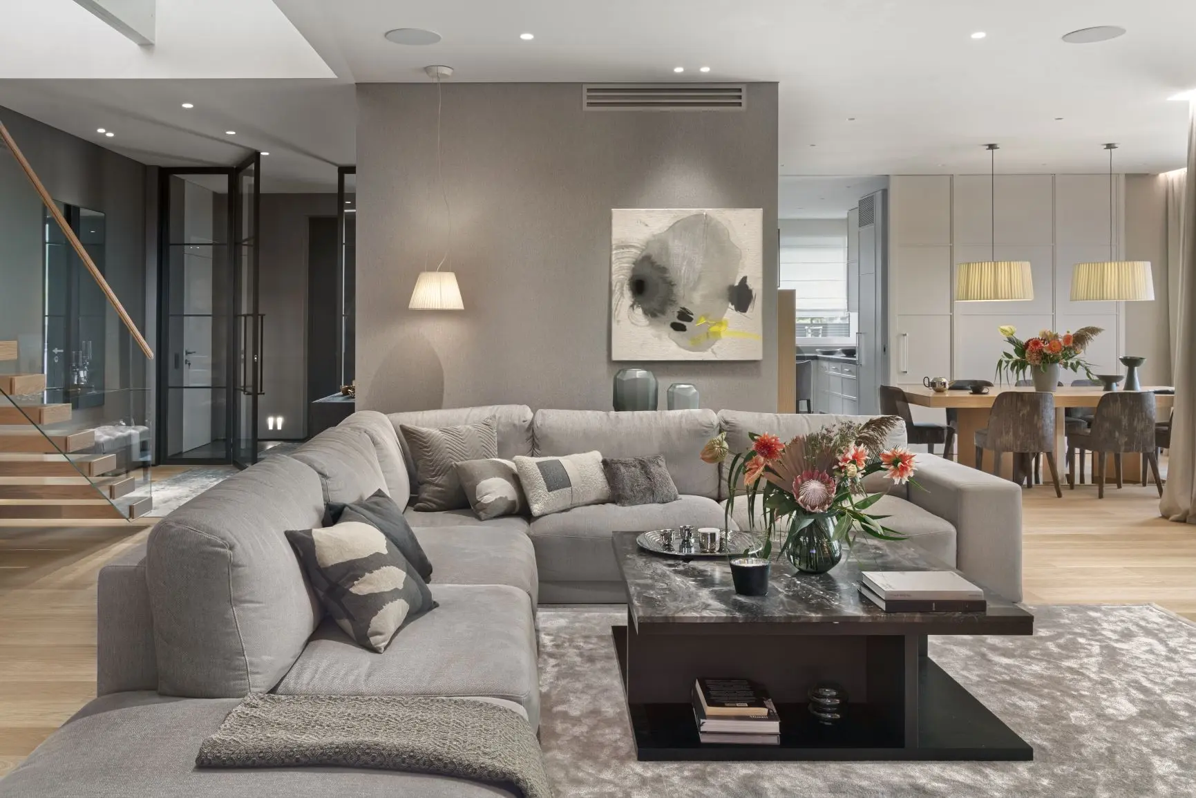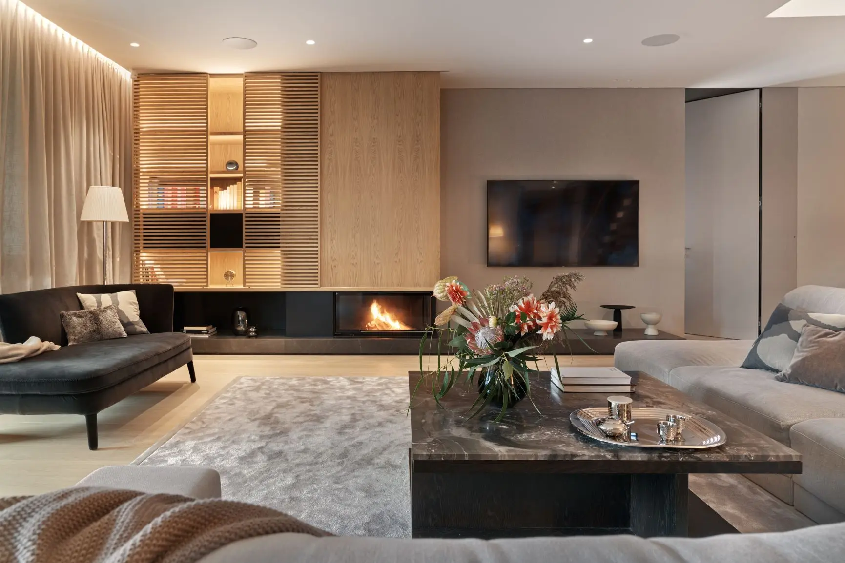 Salon utrzymany jest w ponadczasowych, kojących beżach i spokojnej szarości. Dominującym materiałem wykończeniowym jest tu drewno dębowe w naturalnym wybarwieniu. To szerokie deski podłogowe oraz częściowo ażurowa zabudowa ściany wpływają na ciepły klimat we wnętrzu. Ściany salonu pokryte zostały luksusowymi lśniącymi tapetami marki Arte w odcieniu taupe. Jasnoszary rozłożysty, wygodny narożnik polskiej marki Com 40 zachęca do wspólnego, rodzinnego spędzania czasu przed kominkiem i telewizorem.