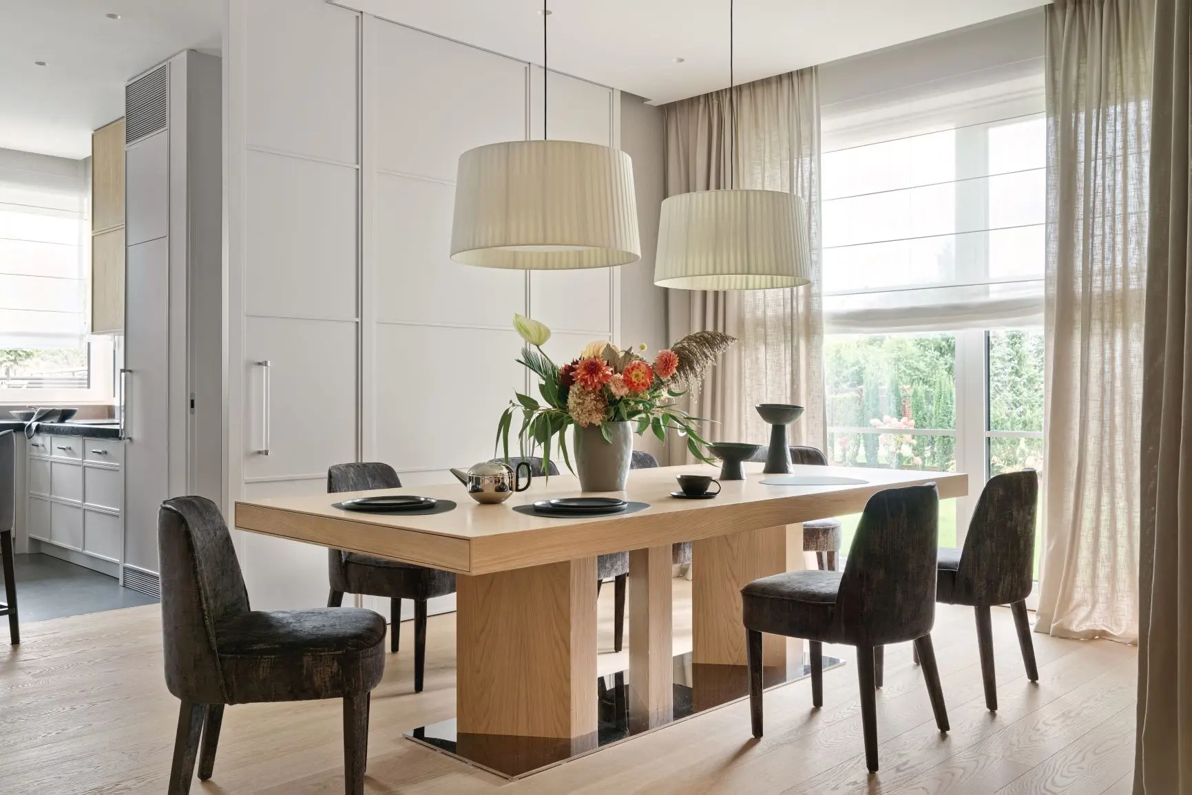 W głębi salonu widzimy jadalnię oraz zabudowę kuchenną. Duży dębowy stół ze stalową podstawą projektu architektki Katarzyny Kraszewskiej znajduje się w bezpośrednim sąsiedztwie kuchni, którą w razie potrzeby można ukryć za suwanymi drzwiami. Strefę jadalni akcentują dwie klasyczne lampy wiszące nad blatem. To modele firmy Santa & Cole. Dają bardzo przyjemne, rozproszone światło. Tapicerowane tkaniną w stonowanej szarości krzesła, gwarantują bezwarunkową wygodę, tak jak i reszta wyposażenia domu. W kuchni zdecydowano się na lakierowane białe fronty kuchenne oraz kamień: na ścianach, blatach i wyspie – jasny marmur i brązowy granit. Zwraca także uwagę zabudowa okapu wykonana z naturalnego kamienia.
