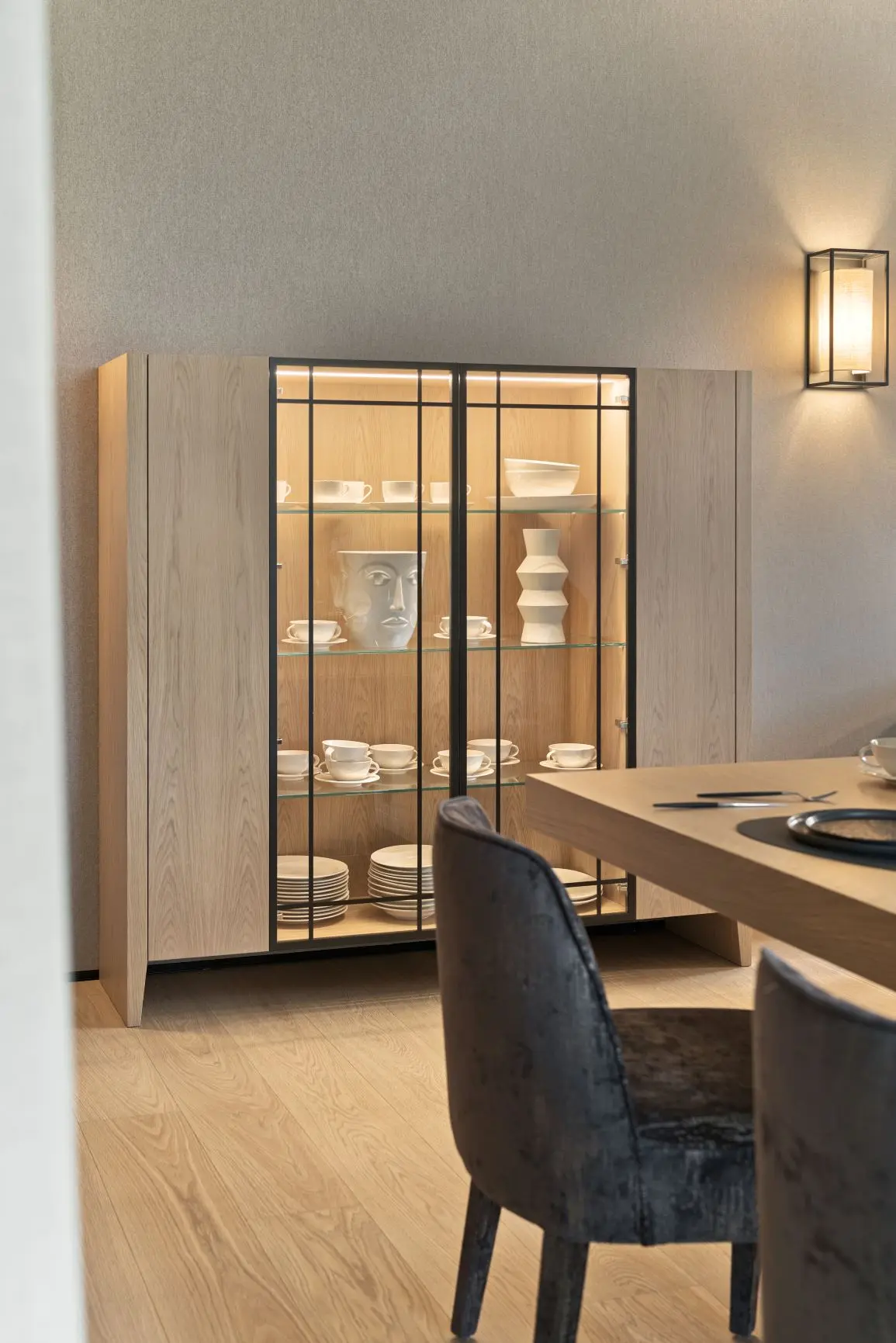 W części jadalnianej parteru ustawiono przeszkloną szafkę spełniającą rolę kredensu. Tutaj pani domu przechowuje porcelanę stołową. Nie bez znaczenia pozostaje fakt, że zarówno mebel w jadalni, jak i zabudowa wokół kominka są podświetlone od wewnątrz. Wieczorem są więc bardzo dekoracyjnymi elementami pokoju dziennego i dodatkowymi źródłami nastrojowego oświetlenia.