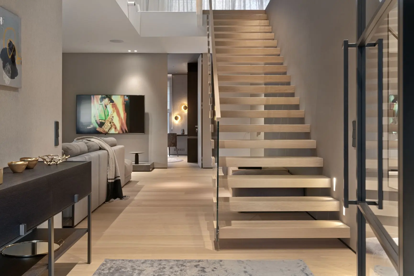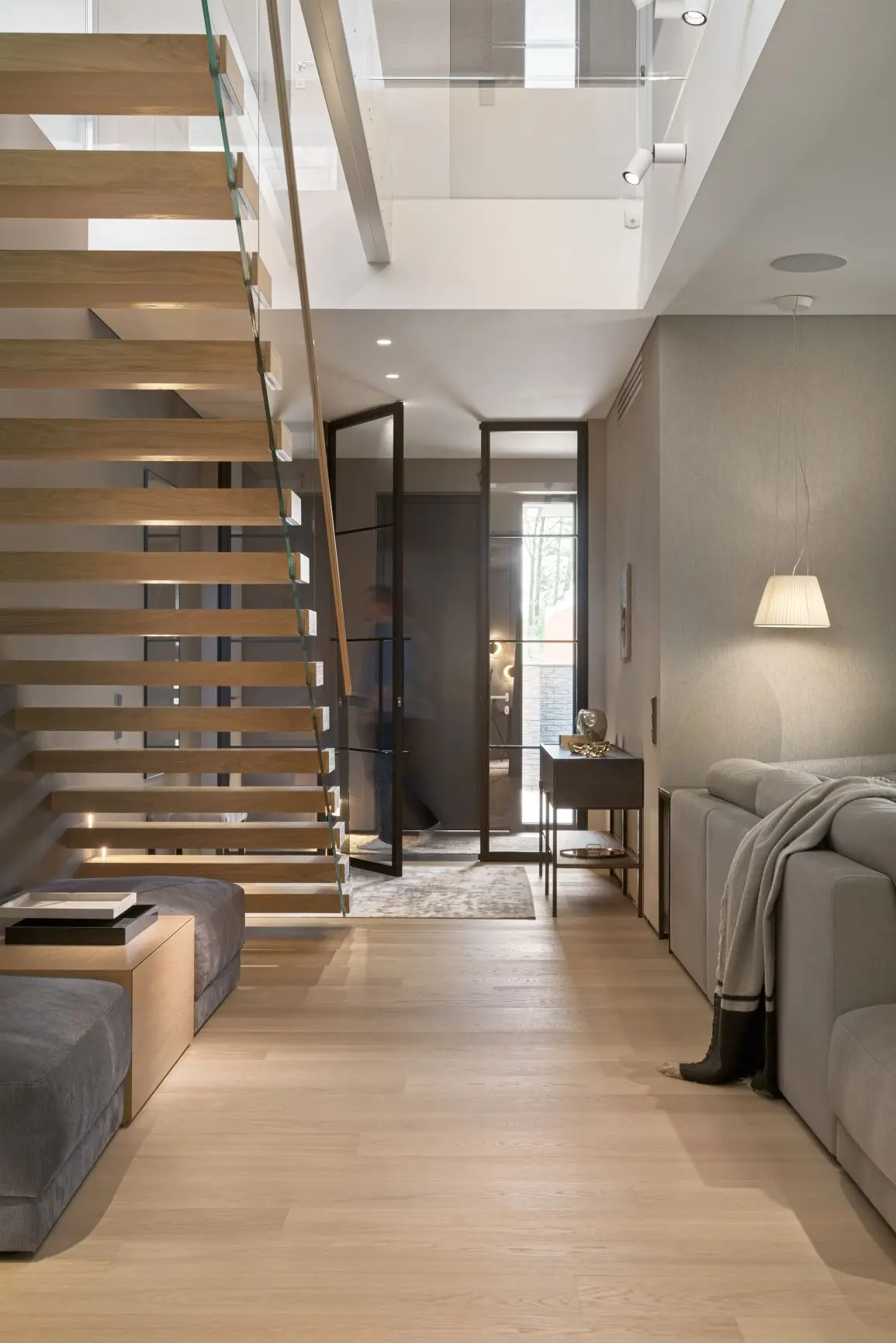 Wnętrza domu są znakomicie oświetlone. Architektce za pomocą opraw technicznych udało się wydobyć urodę szlachetnych materiałów wykończeniowych, fakturę tapet, tkanin, mozaik oraz podkreślić ciekawe rozwiązania architektoniczne, jak chociażby ażury schodów, które rzucają intrygujące cienie na ścianę w salonie.