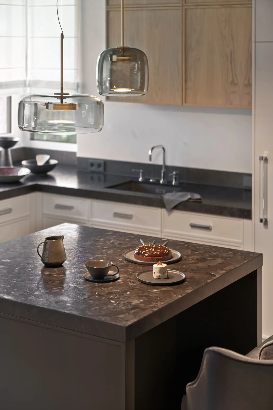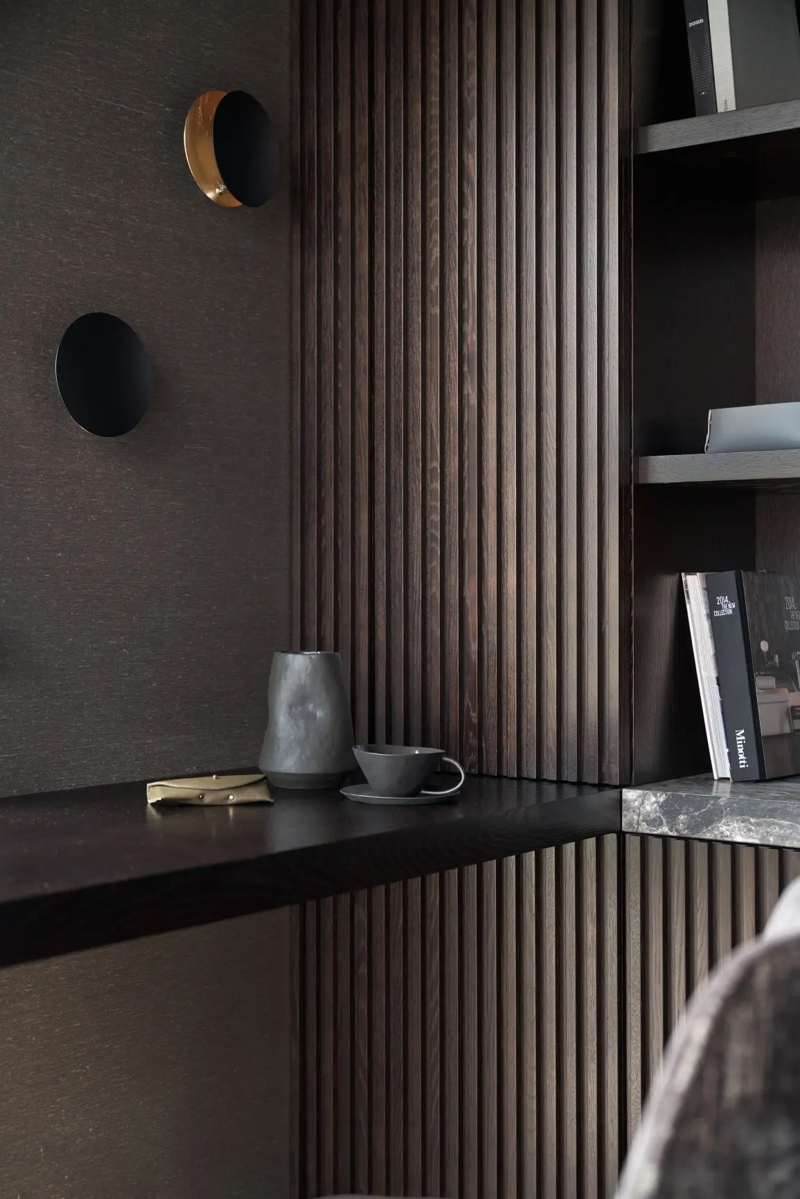 Część dzienna to również uroczy ogród zimowy – salonik zaaranżowany w przeszklonym wykuszu. To miejsce, w którym nawet w pochmurne dni można cieszyć się naturalnym światłem. Stanęła w nim lekka sofa na delikatnych wysokich nóżkach, stolik kawowy projektu architektki oraz rośliny doniczkowe, dla których hodowli panują idealne warunki. Od salonu zimowy ogród oddzielają szklane drzwi przesuwne oraz zasłony z lejącej się szlachetnej tkaniny z połyskiem. Jego podłoga to nie dębowe deski jak w całej strefie dziennej, lecz wielkoformatowe spieki kwarcowe marki Marazzi, które wykorzystane zostały także w innych częściach domu – w kuchni oraz na basenie.
