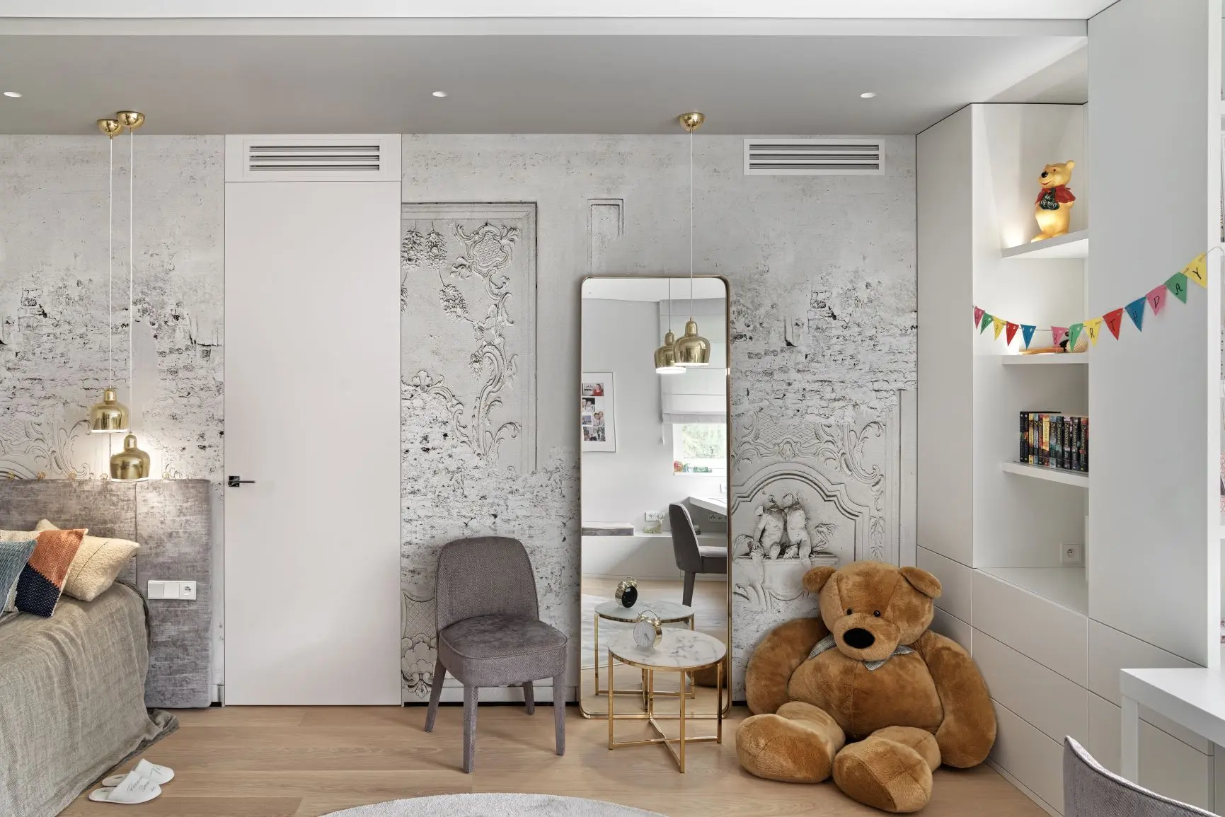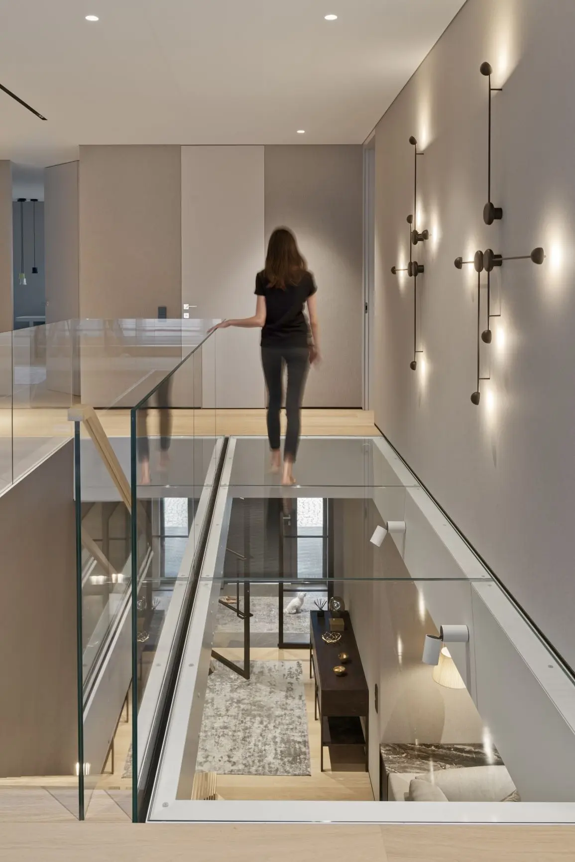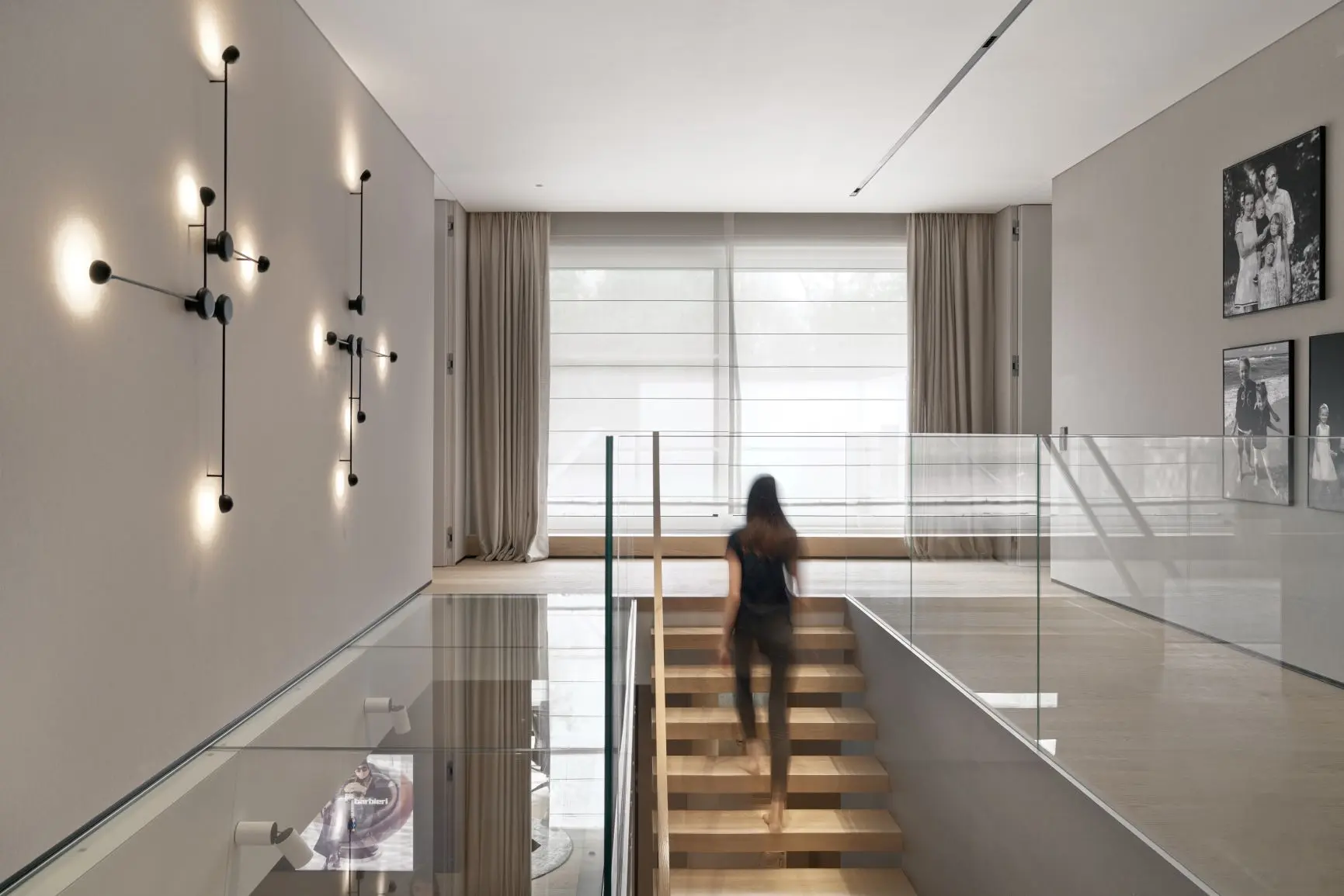 Na piętrze, na które prowadzą drewniane schody o ażurowej konstrukcji zaprojektowano cztery sypialnie, dwie łazienki i wygodne garderoby. Korytarz prowadzący do pokoi dzieci, sypialni właścicieli i łazienki ma szklaną podłogę, która naprawdę robi wrażenie. Widzimy przez nią część salonu. Przy szklanej konstrukcji świetnie wyglądają kinkiety tworzące abstrakcyjną, graficzną kompozycję przywodzącą na myśl kultowy wzór kropek i krzyży z 1947 roku zaprojektowany przez Charlesa i Ray Eamesów.