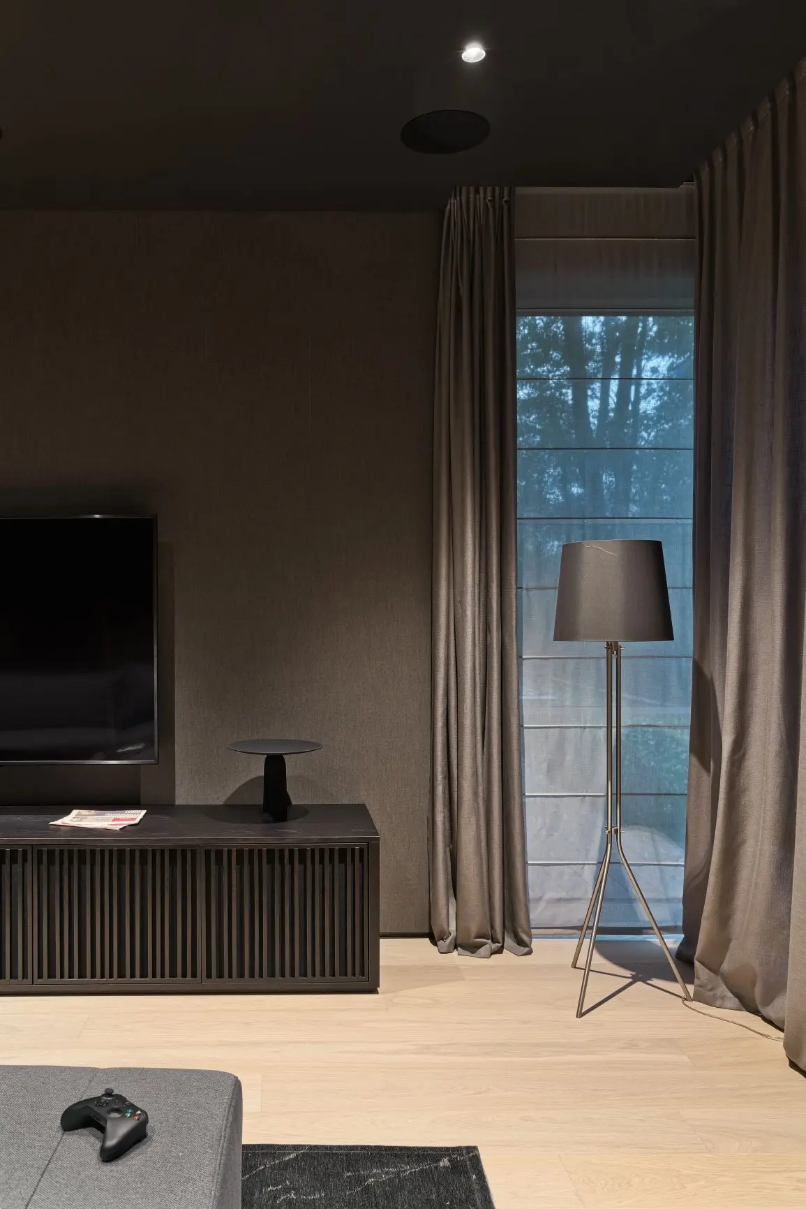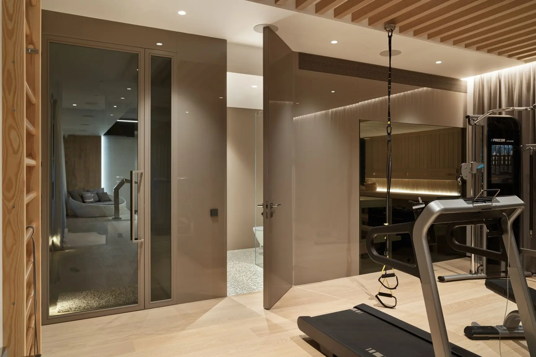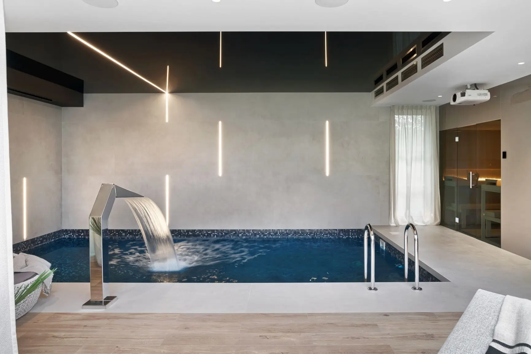 Basen daje radość całej rodzinie. Jest tak elegancki jak cała reszta domu. Pionowe linie opraw led odbijają się w lustrzanej powierzchni napinanego czarnego sufitu i w tafli szmaragdowej wody. Uzyskany w ten sposób efekt jest magiczny! Z basenu możemy przejść do sauny oraz rodzinnej siłowni.